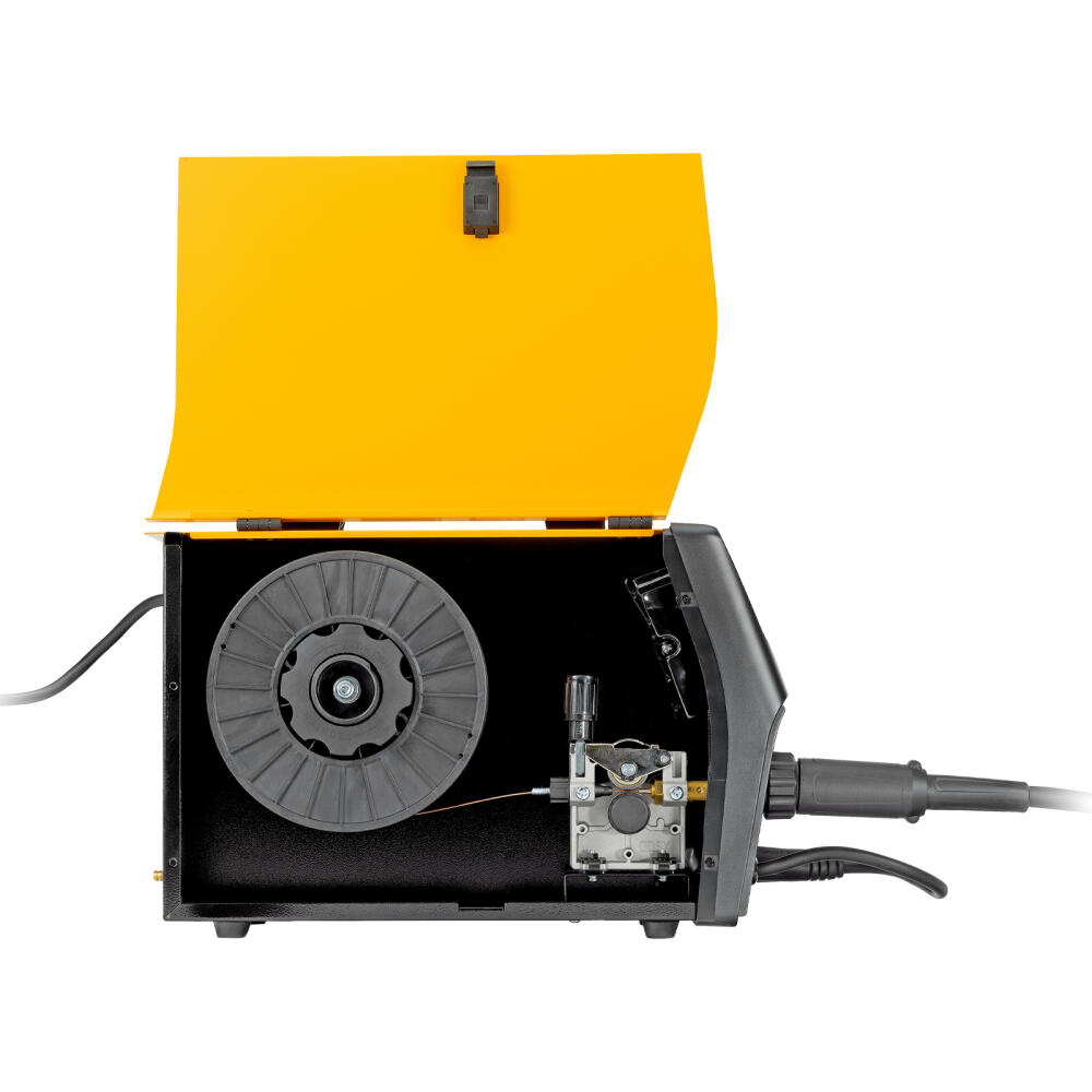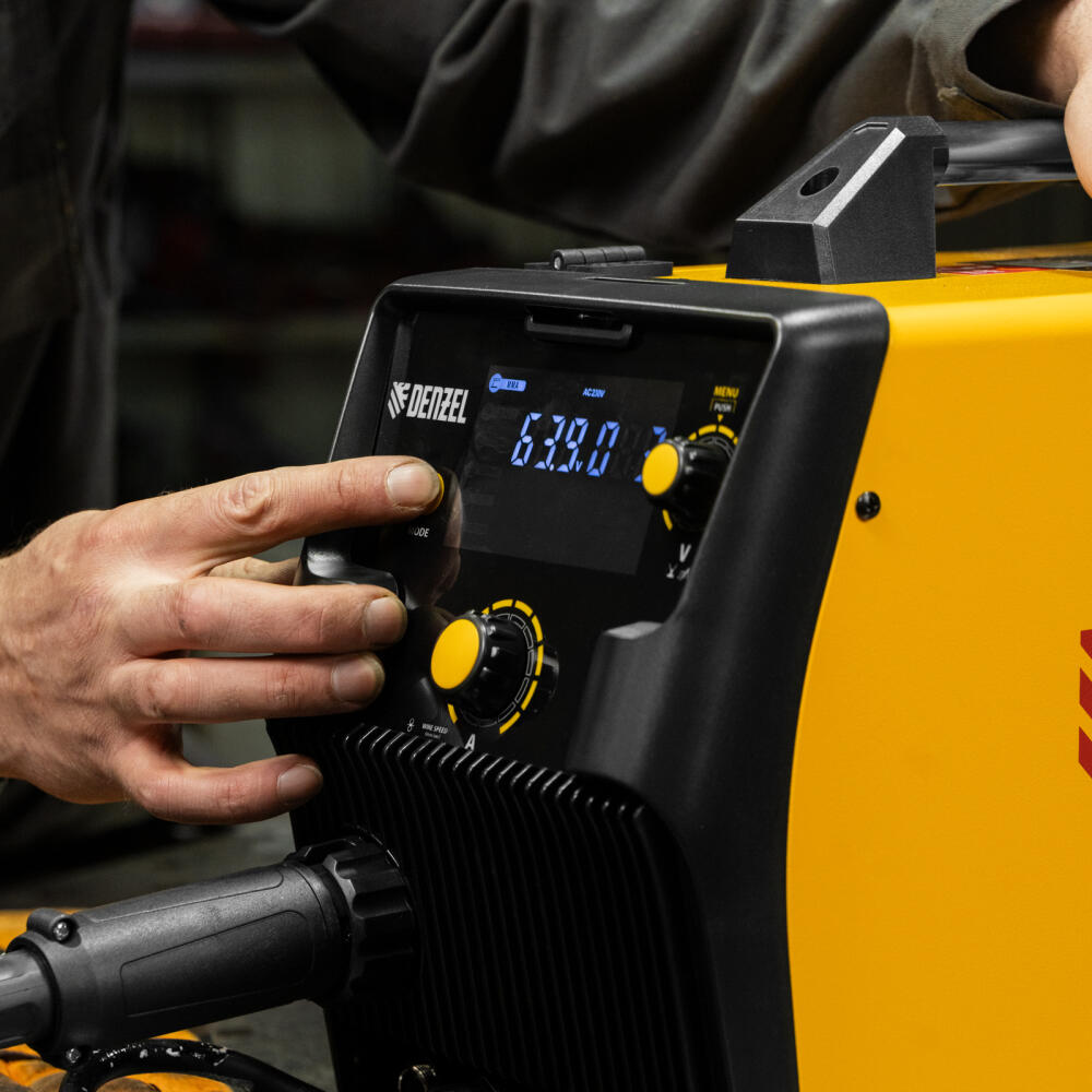 Инверторный аппарат полуавтоматической сварки Denzel IMIG-205SDR 94364 работает с максимальным сварочным током 200 A и совместим с катушками массой от 1 до 5 кг, продолжительность включения составляет 60%. Аппарат разработан с использованием передовой инверторной технологии IGBT, что обеспечивает стабильный сварочный ток на выходе и высокий КПД при низком энергопотреблении. Возможна работа при нестабильном напряжении в сети. Синергетическое управление упрощает подбор параметров сварки в зависимости от конкретной задачи: аппарат предлагает оптимальные значения напряжения, скорости подачи проволоки и т.д.