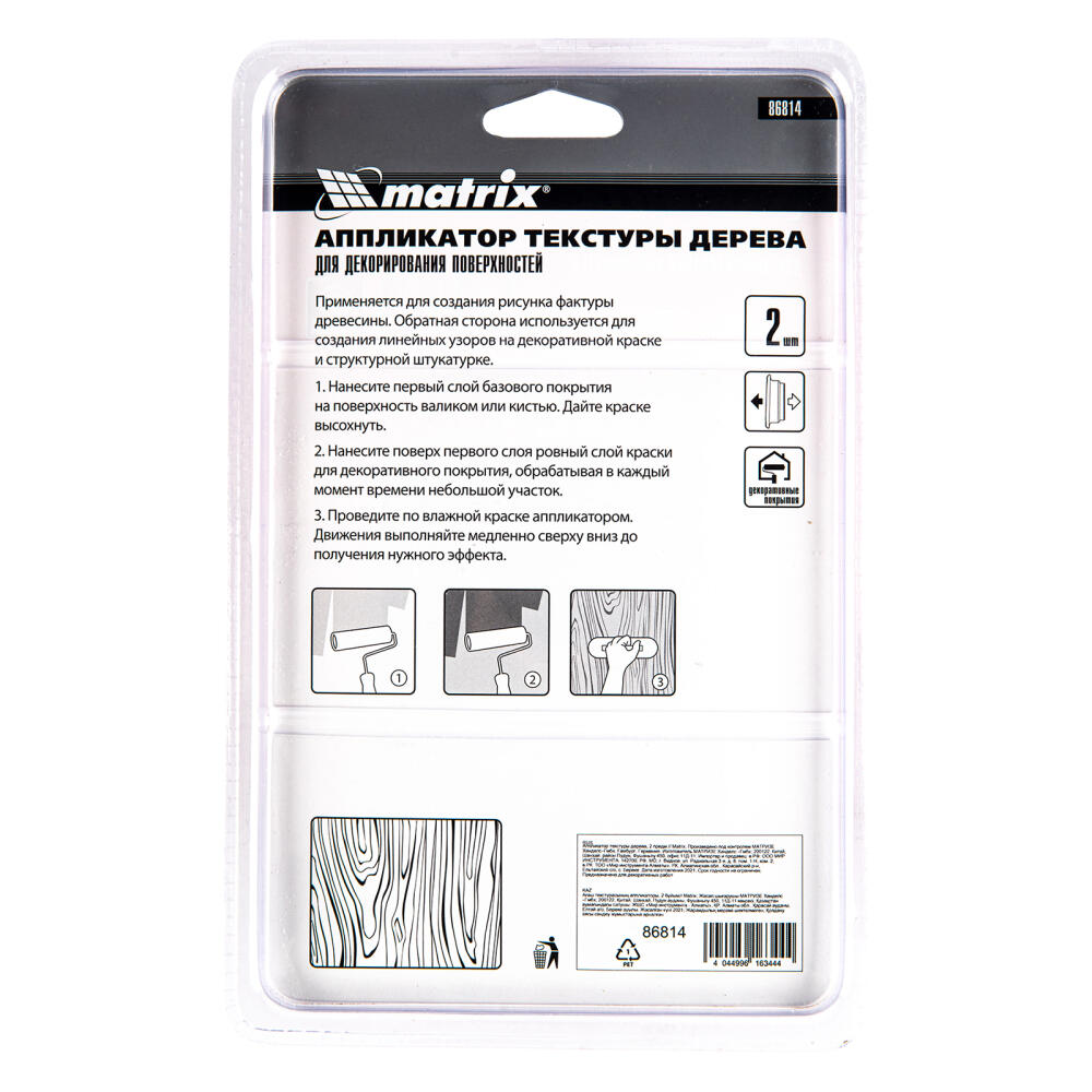 Аппликатор текстуры дерева Matrix 86814, 2 предм., используется на поверхностях из металла, пластика и других. Применяется для нанесения декоративных узоров — создает рисунок фактуры древесины. Обратную сторону аппликатора можно использовать для создания линейных узоров на декоративной краске и структурной штукатурке.