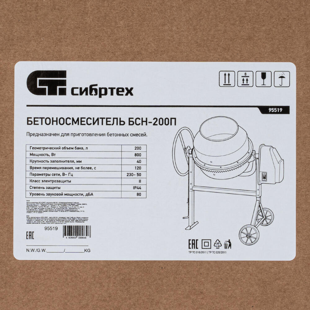 Бетоносмеситель Сибртех БСН-200П 95519 мощностью 800 Вт предназначен для приготовления бетонных смесей и штукатурных растворов. Допускается использование крупнозернистых заполнителей с фракциями размером до 40 мм. Объем бака составляет 200 л, за один замес можно получить до 96 л готовой смеси. Время замешивания не превышает 2 минут, что позволяет избежать длительных перерывов в работе. Бетоносмеситель используется для проведения строительных работ небольшого объема.