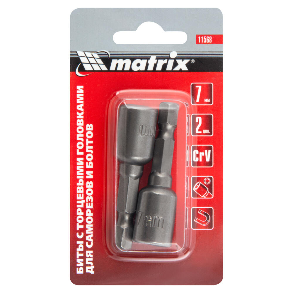 Биты с торцевыми головками Matrix 11568 размером 7 х 45 мм, 2 шт. в уп., предназначены для работ с шуруповертом. Используются при монтаже и демонтаже болтов и шурупов, а также кровельных саморезов с внешним шестигранником. Увеличенная длина 45 мм облегчает работу в труднодоступных местах. Биты способны полностью заменить торцевые головки, особенно если под рукой нет трещотки.