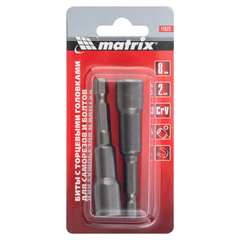 Биты с торцевыми головками Matrix 11573 размером 8 х 65 мм, 2 шт. в уп., предназначены для работ с шуруповертом. Используются при монтаже и демонтаже болтов и шурупов, а также кровельных саморезов с внешним шестигранником. Увеличенная длина 65 мм облегчает работу в труднодоступных местах. Биты способны полностью заменить торцевые головки, особенно если под рукой нет трещотки.