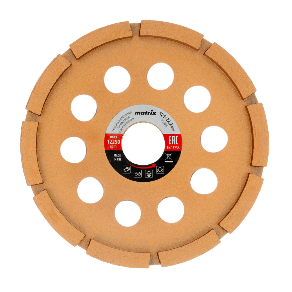 Однорядная алмазная зачистная чашка Matrix 72985 диаметром 125 мм имеет посадочное отверстие 22,2 мм для установки на вал углошлифовальной машины. Используется для обдирочных и зачистных работ по бетону, мрамору, граниту, камню, кирпичной кладке. Придает поверхности шероховатость, улучшающую сцепление со строительными растворами. Чашка предназначена для профессиональных строительных и ремонтных работ.