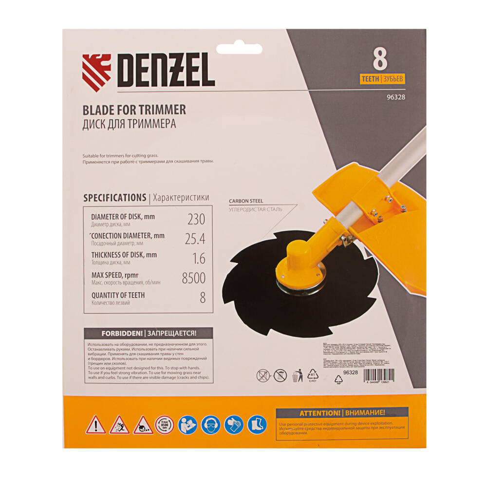 Диск для триммера Denzel 96328 диаметром 230 х 25,4 мм, толщиной 1,6 мм, с 8 лезвиями, предназначен для скашивания травы различных типов, в том числе с жесткими стеблями (полыни, крапивы, лебеды). Также способен скашивать молодые побеги кустарников с диаметром стеблей не более 3 мм. Рекомендован к использованию со всеми типами бензиновых триммеров, а также с электрическими триммерами мощностью не менее 1,2 кВт, например, Denzel 96611 и 96612.