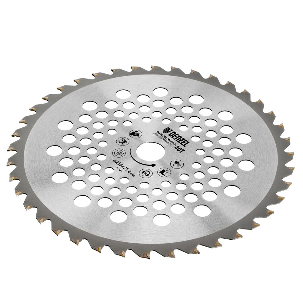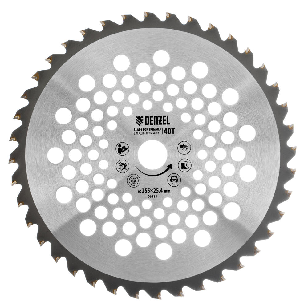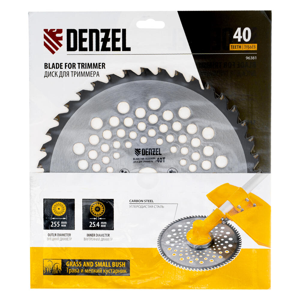 Диск для триммера Denzel 96381 размером 255 х 25,4 мм, с 40 зубьями, предназначен для скашивания травы и мелкого кустарника. Устанавливается на вал бензинового триммера или электрических моделей с верхним расположением двигателя и прямой штангой. Будет полезен для ухода за дачным участком.