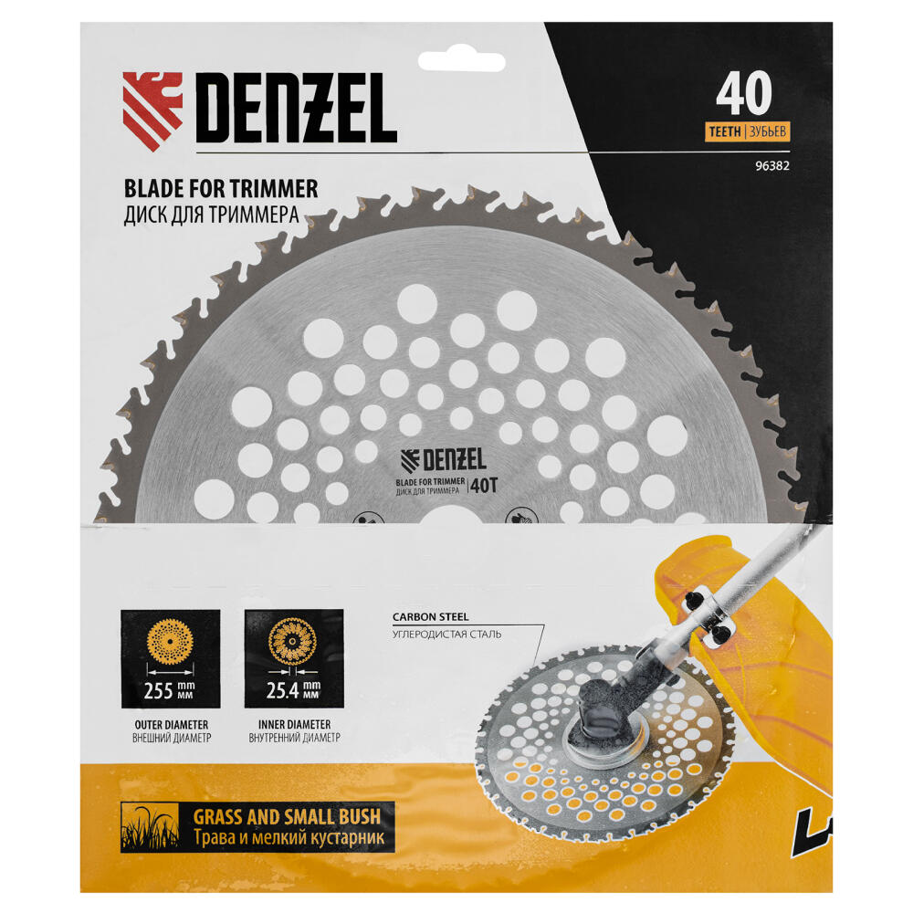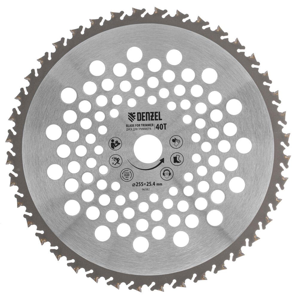 Диск для триммера Denzel 96382 с внешним диаметром 255 мм и посадочным — 25,4 мм, с 40 зубьями Anti-Kick, используется для скашивания жесткой травы, борщевика и других сорняков с толстыми стеблями, а также подпиливания кустарников и тонких деревьев. Оптимален для работы с мощными бензотриммерами. Будет полезен для расчистки территории и подготовки участка к вспашке и застройке.