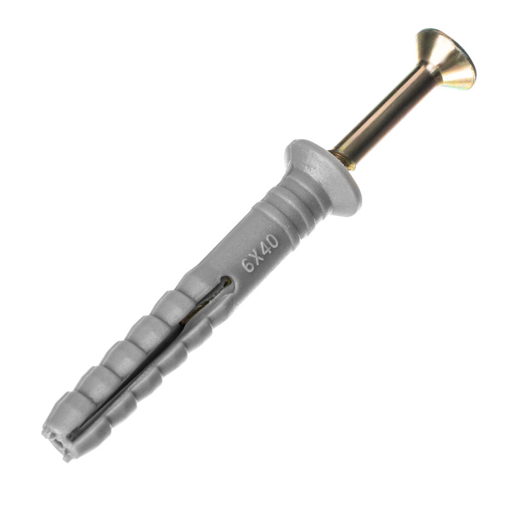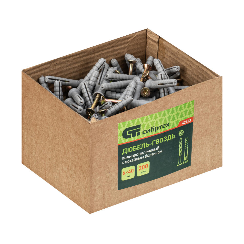 Полипропиленовый дюбель-гвоздь Сибртех 42123 с потайным бортиком, размером 6 х 40 мм, 200 шт. в упаковке, предназначен для закрепления деталей и конструкций на основаниях из бетона, кирпича или камня. Потайной бортик дюбеля обеспечивает максимальный контакт крепежа с прикрепляемым материалом. В комплект поставки входят саморезы со шляпкой типоразмера PZ2. Дюбель-гвоздь применяется при проведении строительных и ремонтных работ, прокладке сетей, а также для решения бытовых задач.