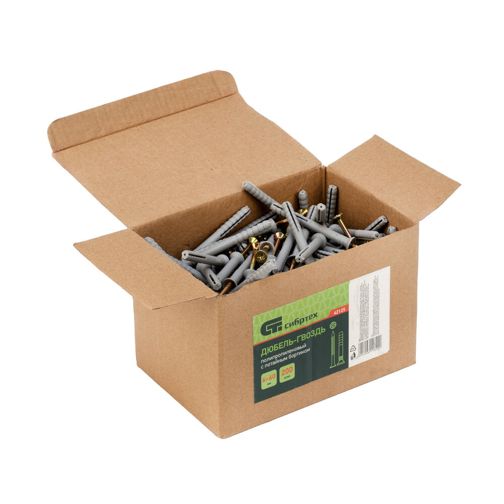 Полипропиленовый дюбель-гвоздь Сибртех 42125 с потайным бортиком, размером 6 х 60 мм, 200 шт. в упаковке, предназначен для закрепления деталей и конструкций на основаниях из бетона, кирпича или камня. Потайной бортик дюбеля обеспечивает максимальный контакт крепежа с прикрепляемым материалом. В комплект поставки входят саморезы со шляпкой типоразмера PZ2. Дюбель-гвоздь применяется при проведении строительных и ремонтных работ, прокладке сетей, а также для решения бытовых задач.