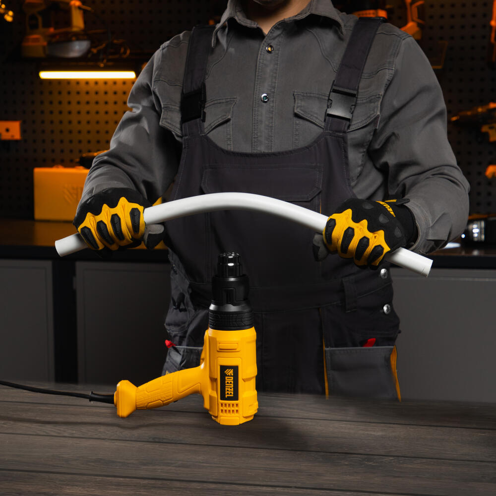 Фен технический Denzel HG-1800 28001 мощностью 1,8 кВт работает в 3 режимах: с температурой 50/450/550 ℃ и производительностью 250/250/500 л/мин соответственно. Используется в качестве источника горячего воздуха для нагрева и просушивания различных материалов, снятия лакокрасочных покрытий, сварки изделий из пластика, дезинфекции поверхностей, а также при проведении слесарных работ, ремонта и строительства. Набор стандартных опций без лишнего функционала обеспечивает идеальное соотношение цены и качества, делает инструмент оптимальным вариантом для бытового применения.