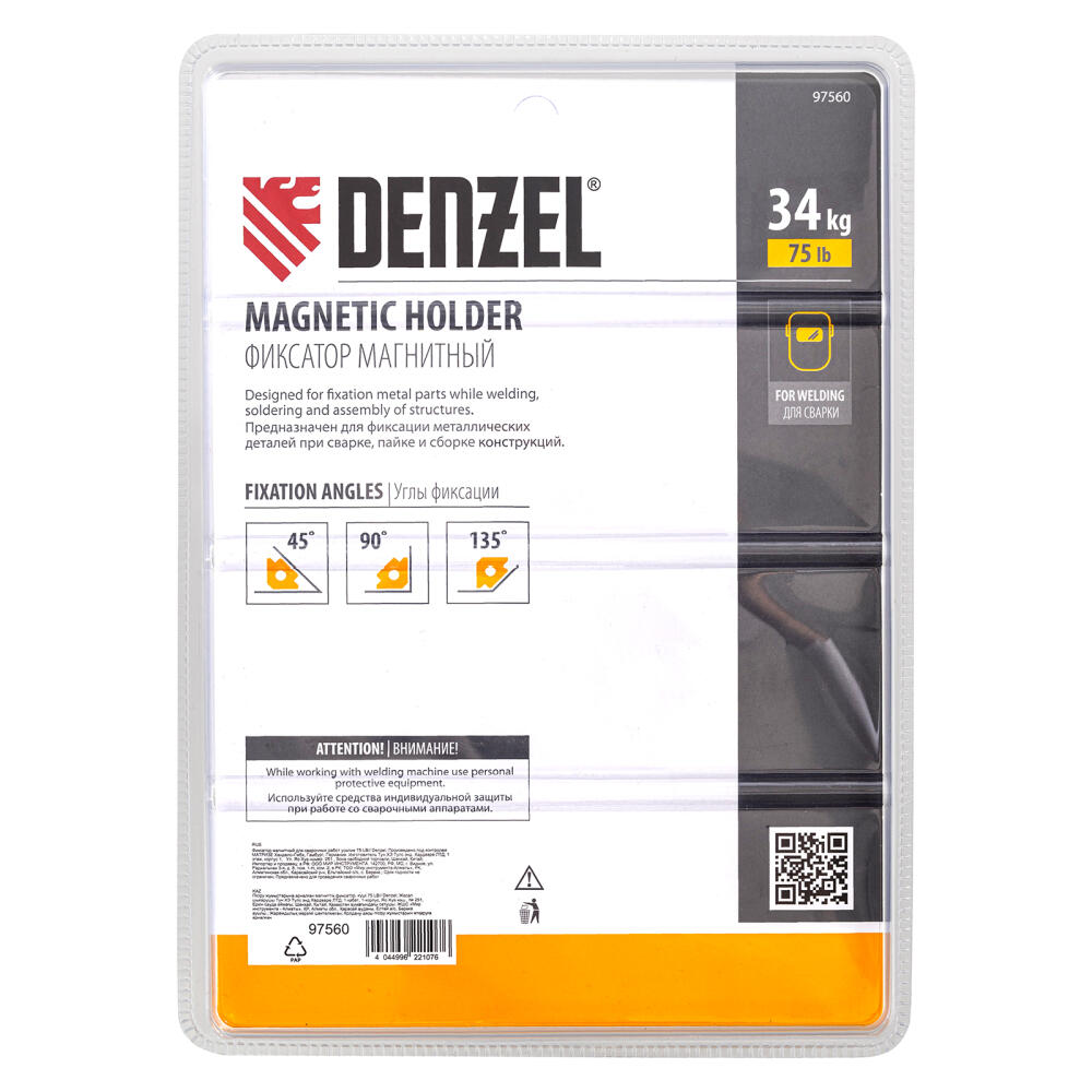 Фиксатор магнитный Denzel 97560 выдерживает усилие 75 LB (34 кг) и используется при проведении сварочных работ. Надежно фиксирует детали разного размера под углом 45°, 90° и 135° без риска их смещения или падения.