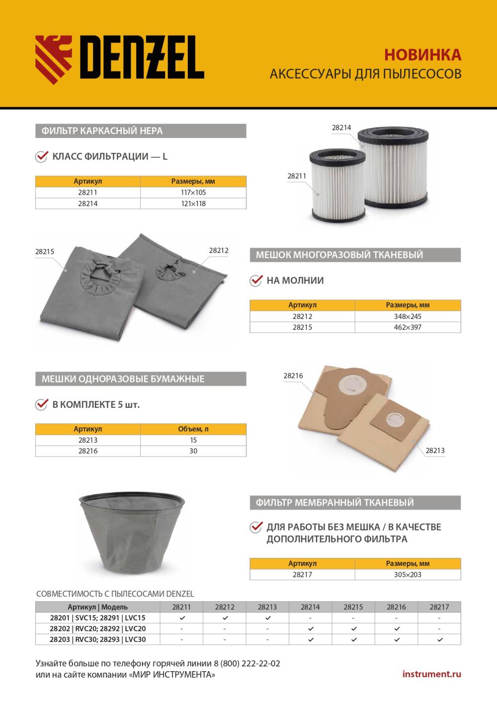Мембранный тканевый фильтр Denzel 28217 совместим со строительными пылесосами RVC30 (28203), LVC30 (28293). Устанавливается в бак пылесоса и служит для дополнительной фильтрации, а также позволяет проводить сухую уборку без использования мешка.