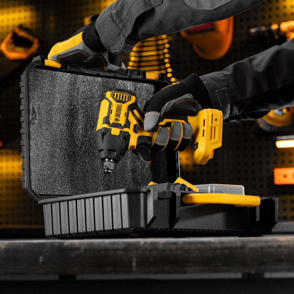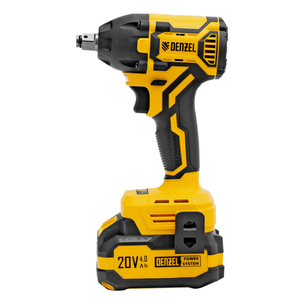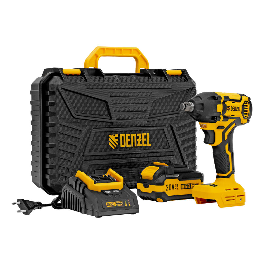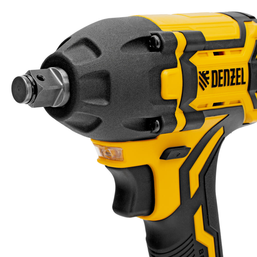 Аккумуляторный ударный гайковерт Denzel CIWH-BL-20-350 26520 с бесщеточным двигателем работает от аккумулятора Li-Ion 20 В и используется для закручивания и откручивания гаек, болтов и другого резьбового крепежа. Доступно 3 режима работы, при которых частота вращения шпинделя составляет 0-1500, 0-2000 и 0-2500 об/мин, а частота ударов — 0-2100, 0-2800 и 0-3500 уд/мин. Реализована функция электронной регулировки частоты вращения в зависимости от степени нажатия на клавишу пуска, что позволяет установить оптимальную скорость и усилие затяжки. Максимальный крутящий момент составляет 350 Н·м — этого достаточно для эффективного решения поставленных задач. Ударный механизм упрощает работу с туго затянутым и заржавевшим крепежом.