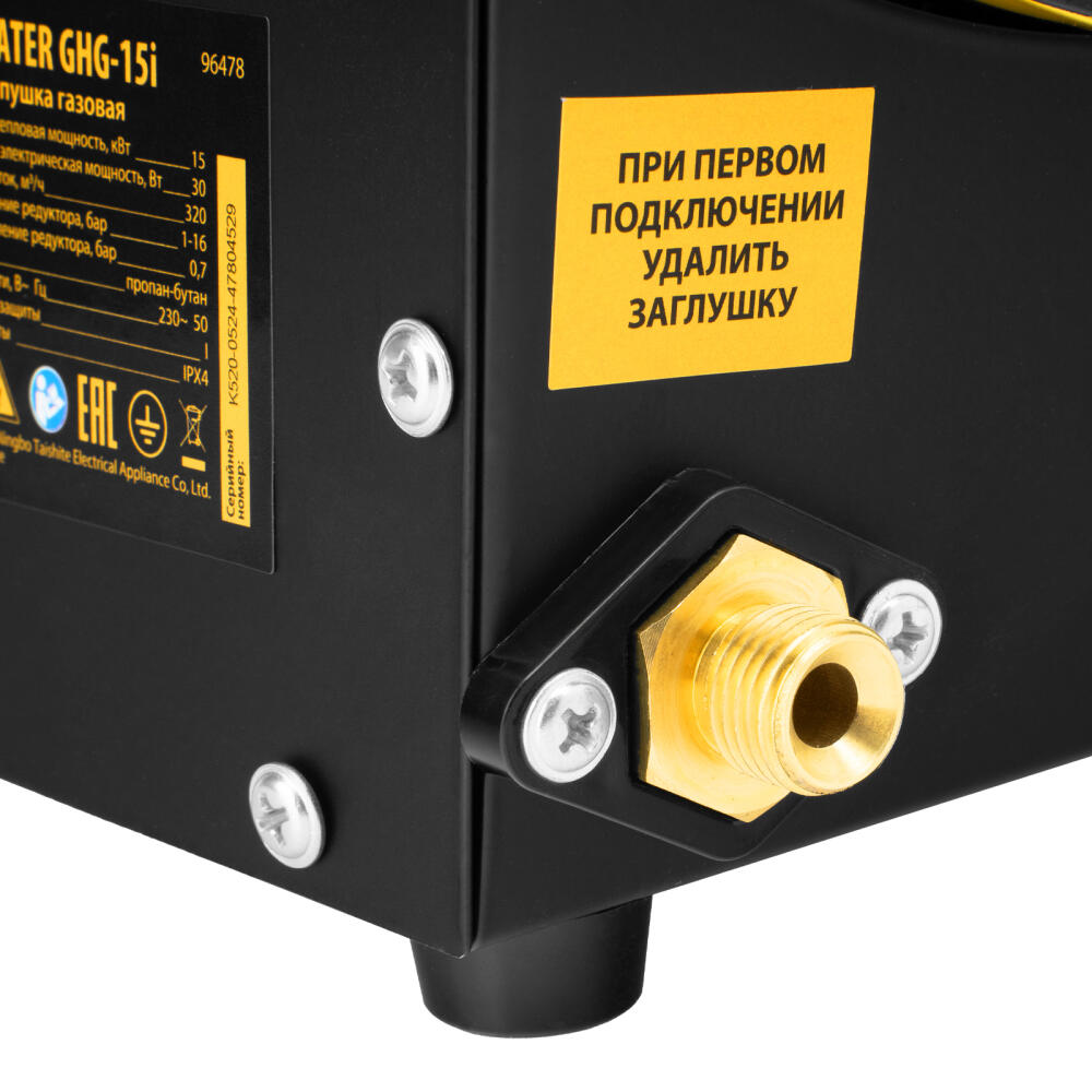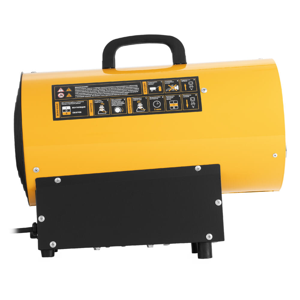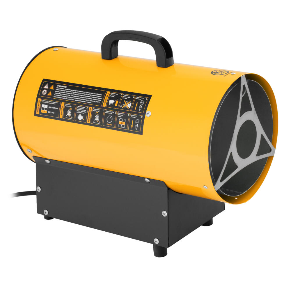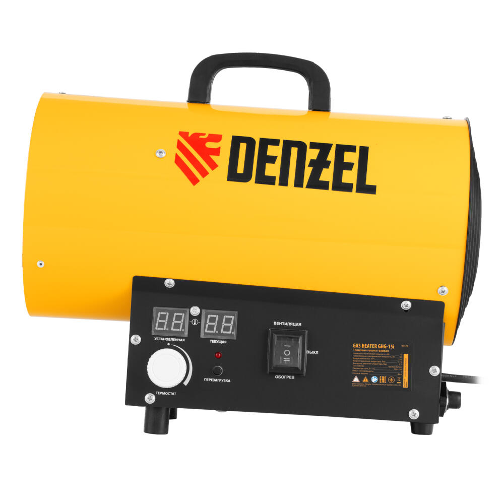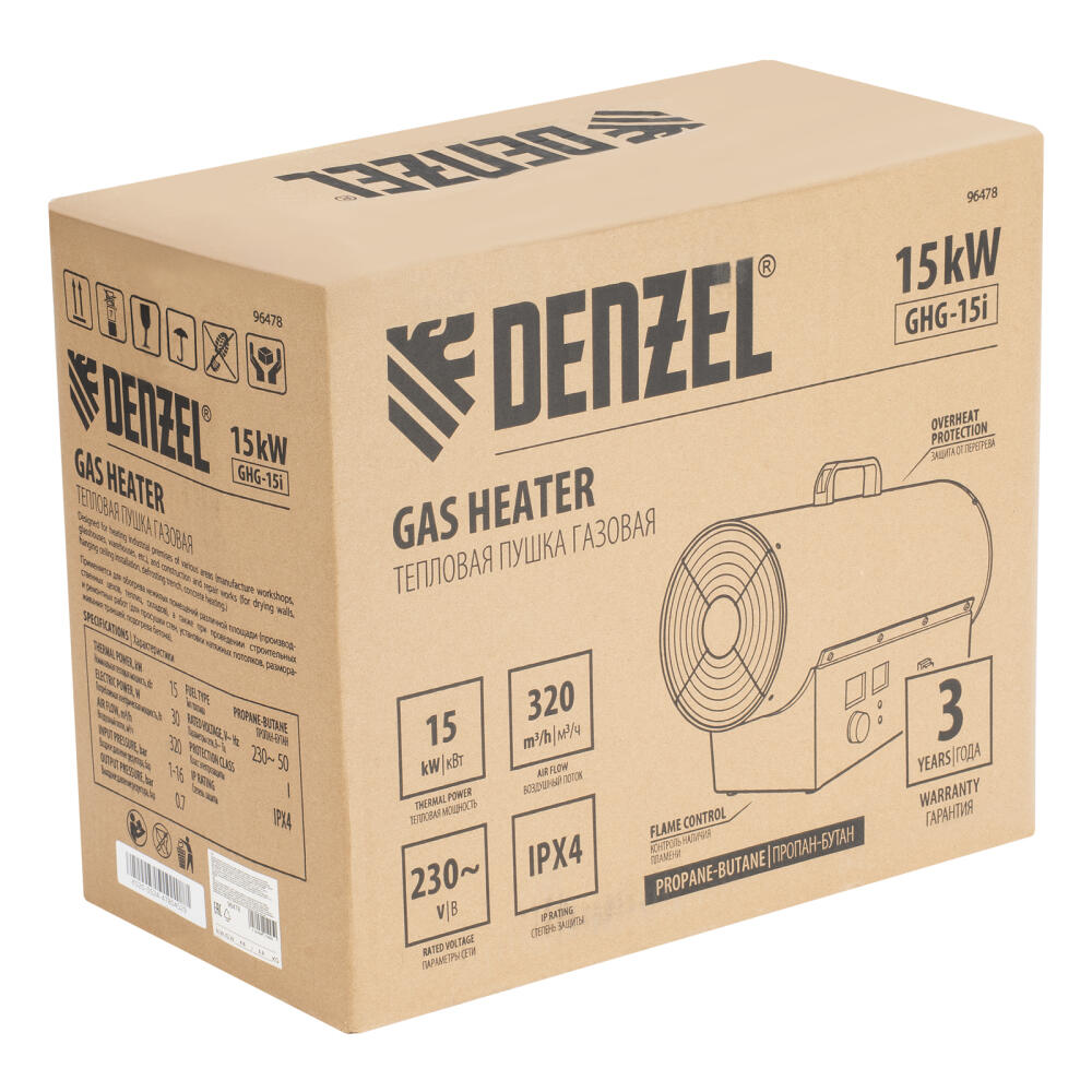 Газовая тепловая пушка Denzel GHG-15i 96478 мощностью 15 кВт, с цифровым термостатом и двойным электромагнитным клапаном, работает на сжиженном газе пропан-бутан и предназначена для обогрева хорошо вентилируемых нежилых помещений площадью до 150 кв. м: складов, цехов, гаражей, мастерских, теплиц. Генерирует воздушный поток 320 куб. м/ч, поэтому эффективно справляется с поставленными задачами. Используется на строительных и производственных объектах, для монтажа натяжных потолков.