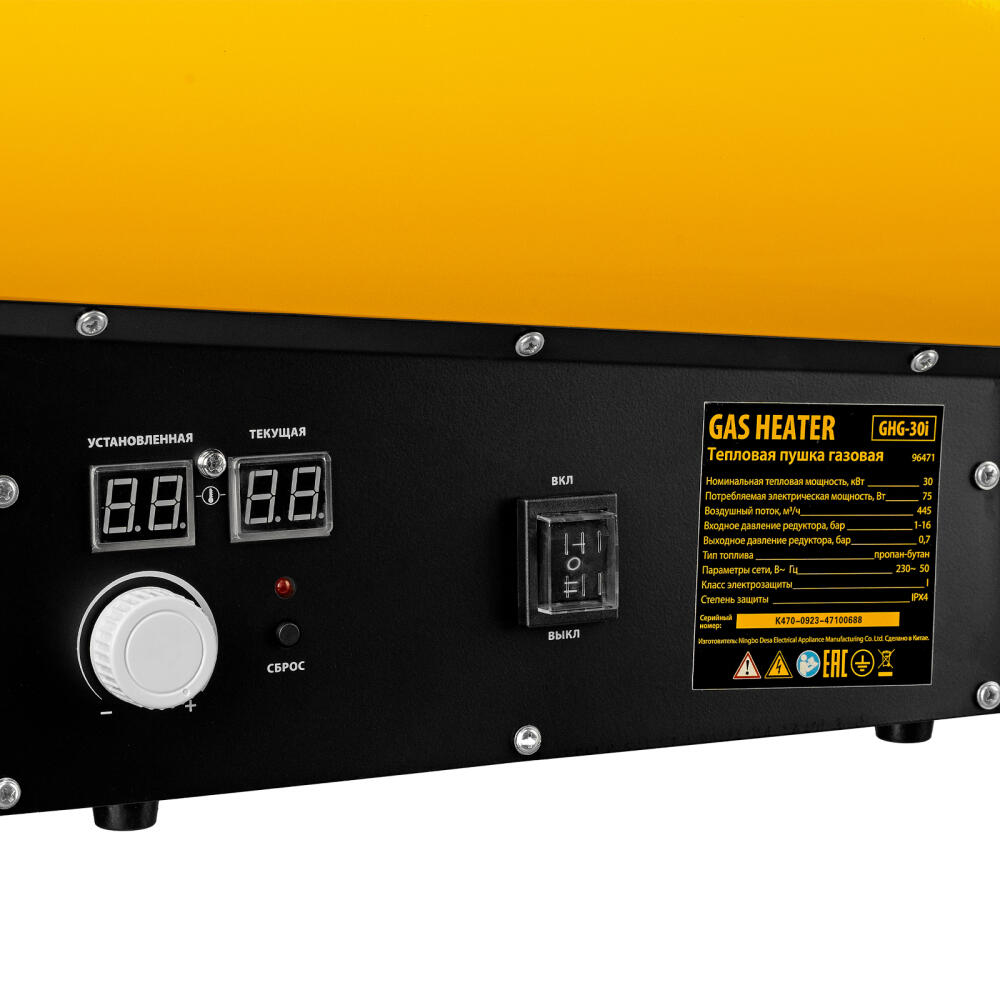 Газовая тепловая пушка Denzel GHG-30i 96471 мощностью 30 кВт, с цифровым термостатом и двойным электромагнитным клапаном, работает на сжиженном газе пропан-бутан и предназначена для обогрева хорошо вентилируемых нежилых помещений площадью до 300 кв. м: складов, цехов, гаражей, мастерских, теплиц. Генерирует воздушный поток 445 куб. м/ч, поэтому эффективно справляется с поставленными задачами. Используется на строительных и производственных объектах, для монтажа натяжных потолков.