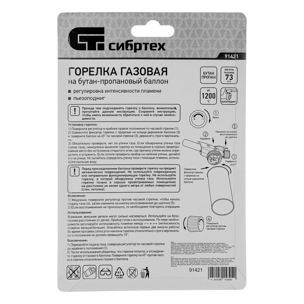 Газовая горелка Сибртех 91421 с пьезоподжигом предназначена для установки на бутановый баллон. Позволяет развести огонь без применения химических средств, нагреть замерзшие детали или пластиковые поверхности для сгибания, а также спаять медные трубы. Горелка пригодится в домашнем хозяйстве, в походе или на даче, а также будет полезна во время ремонта автомобиля.