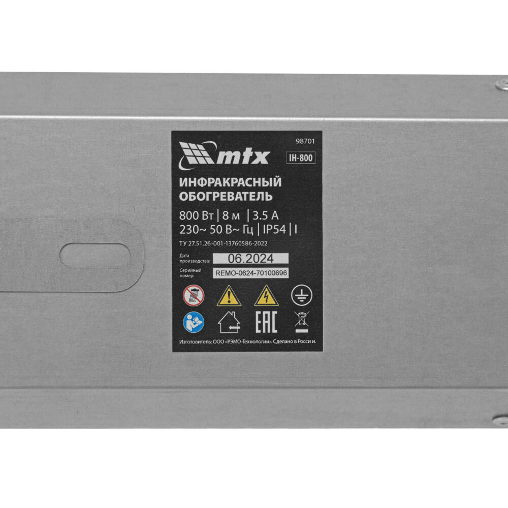 Инфракрасный обогреватель MTX IH-800 98701 подключается к сети 230 В, потребляет мощность до 800 Вт, защищен по стандарту IP54 и оснащен кабелем длиной 1,8 м с вилкой. Предназначен для обогрева помещений, благодаря высокой степени защиты IP54 не боится влаги, поэтому может быть установлен на улице под открытым небом, на открытых верандах, в беседках, курятниках, теплицах и подвальных помещениях, часто используется для сушки деревянных поверхностей. Служит основным источником тепла на площади до 8 м² и дополнительным — в помещениях до 16 м². Произведен в России.