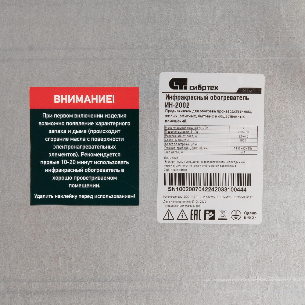Инфракрасный обогреватель Сибртех ИН-2002 96458 подключается к сети 230 В, потребляет мощность до 2000 Вт и предназначен для создания комфортных температурных условий в помещении в холодное время года. Служит основным источником тепла на площади до 20 кв. м и дополнительным — в помещениях до 40 кв. м.,Одно из ключевых преимуществ обогревателя — энергоэффективность. Инфракрасное тепло передается сквозь воздух, не нагревая его, а нагревая предметы, находящиеся на расстоянии. Примерно по такому принципу на Землю передается тепло от Солнца. Вы ощутите его сразу, не дожидаясь прогрева всего воздуха в помещении.
