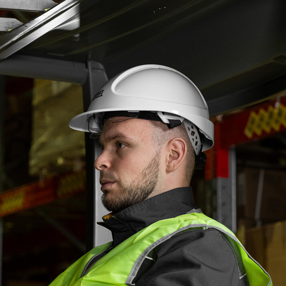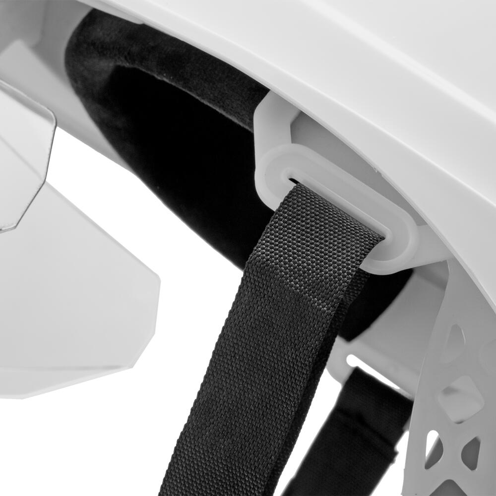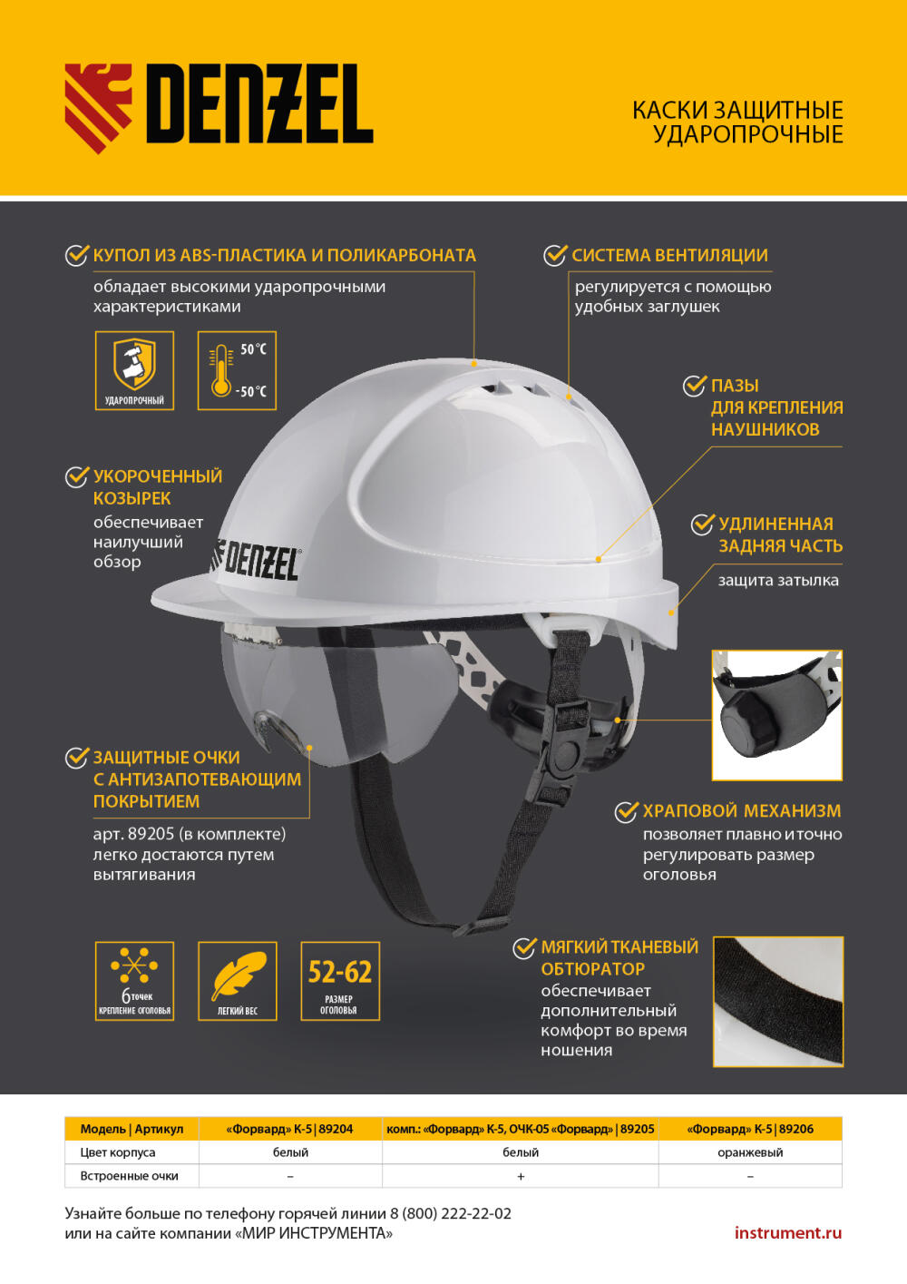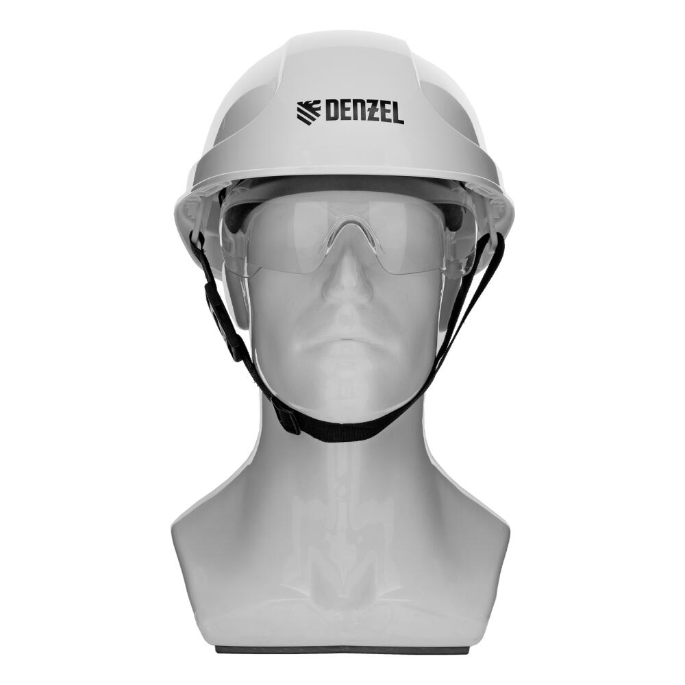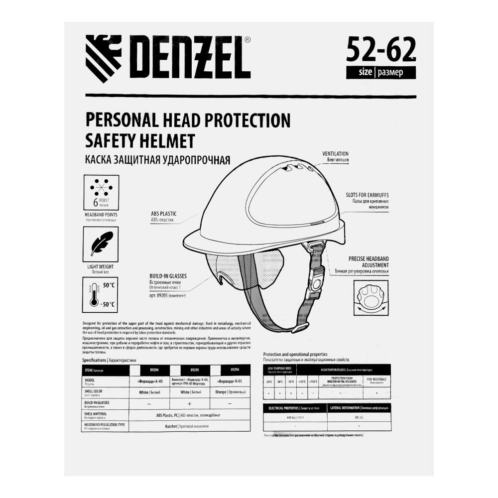 Защитная ударопрочная каска Denzel «Форвард» К-05 89205 белого цвета, со встроенными очками ОЧК-5, изготовлена из ABS-пластика и поликарбоната и предназначена для защиты головы работника от механических воздействий и влаги. Удлиненная задняя часть защищает затылок, дополнительную защиту обеспечивают открытые очки с антизапотевающим покрытием. Они легко вытягиваются из оголовья и так же легко убираются обратно. Каска сочетает в себе современный функциональный дизайн, надежность и практичность. Несмотря на небольшой вес, обеспечивает максимальную защиту и комфорт пользователя. Необходима на строительной площадке и на производстве.