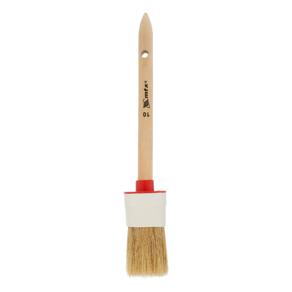 Круглая кисть MTX №10 82080 диаметром 40 мм, с натуральной щетиной и деревянной ручкой, пригодится в быту для окрашивания узких длинных поверхностей. Светлая натуральная свиная щетина с добавлением искусственной обладает высокой износоустойчивостью и может использоваться для нанесения красок с содержанием растворителей, а также масляных красок и лаков.