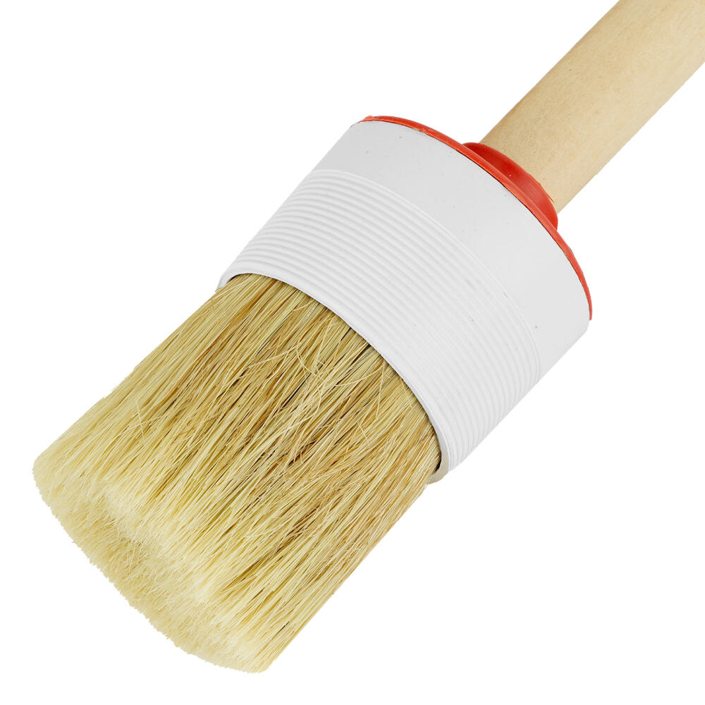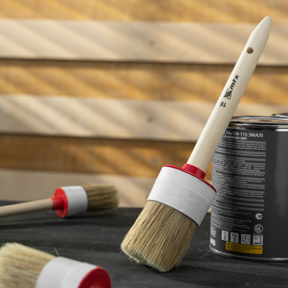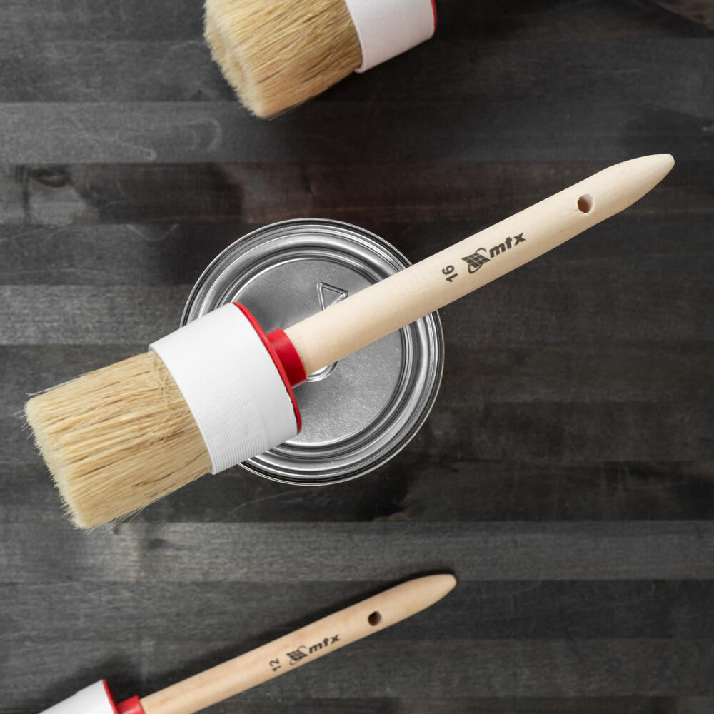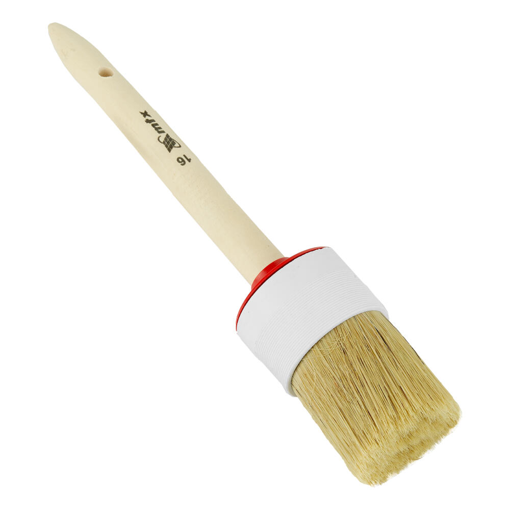 Круглая кисть MTX №16 82086 диаметром 55 мм, с натуральной щетиной и деревянной ручкой, пригодится в быту для окрашивания узких длинных поверхностей. Светлая натуральная свиная щетина с добавлением искусственной обладает высокой износоустойчивостью и может использоваться для нанесения красок с содержанием растворителей, а также масляных красок и лаков.