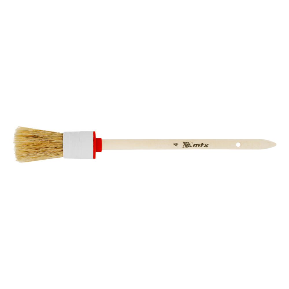 Круглая кисть MTX №4 82074 диаметром 25 мм, с натуральной щетиной и деревянной ручкой, пригодится в быту для окрашивания узких длинных поверхностей. Светлая натуральная свиная щетина с добавлением искусственной обладает высокой износоустойчивостью и может использоваться для нанесения красок с содержанием растворителей, а также масляных красок и лаков.