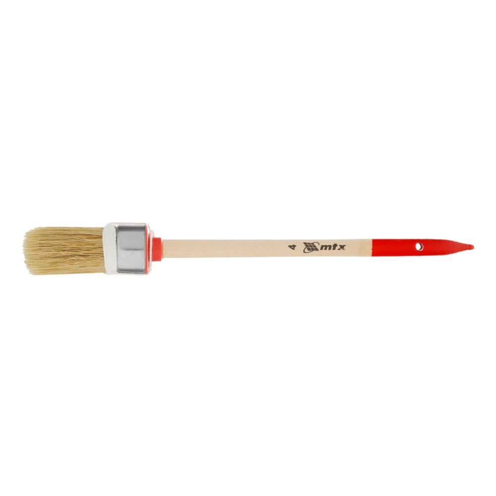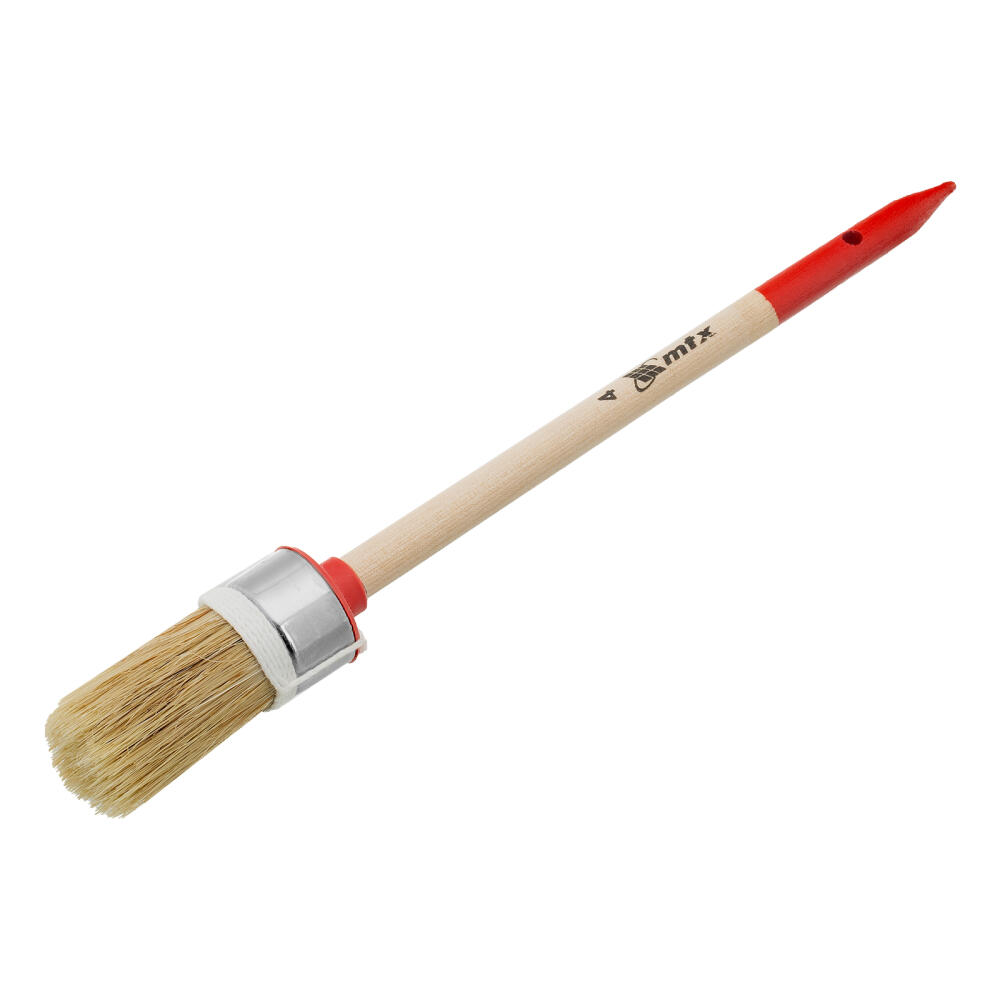 Круглая кисть MTX Профи №4 82042 диаметром 25 мм, с натуральной щетиной и деревянной ручкой, используется при проведении профессиональных малярных работ. Рабочая часть из натуральной свиной щетины с небольшим добавлением искусственной устойчива к агрессивным масляным краскам и ЛКМ на основе растворителей. Круглая кисть оптимально подходит для окрашивания узких и труднодоступных участков.
