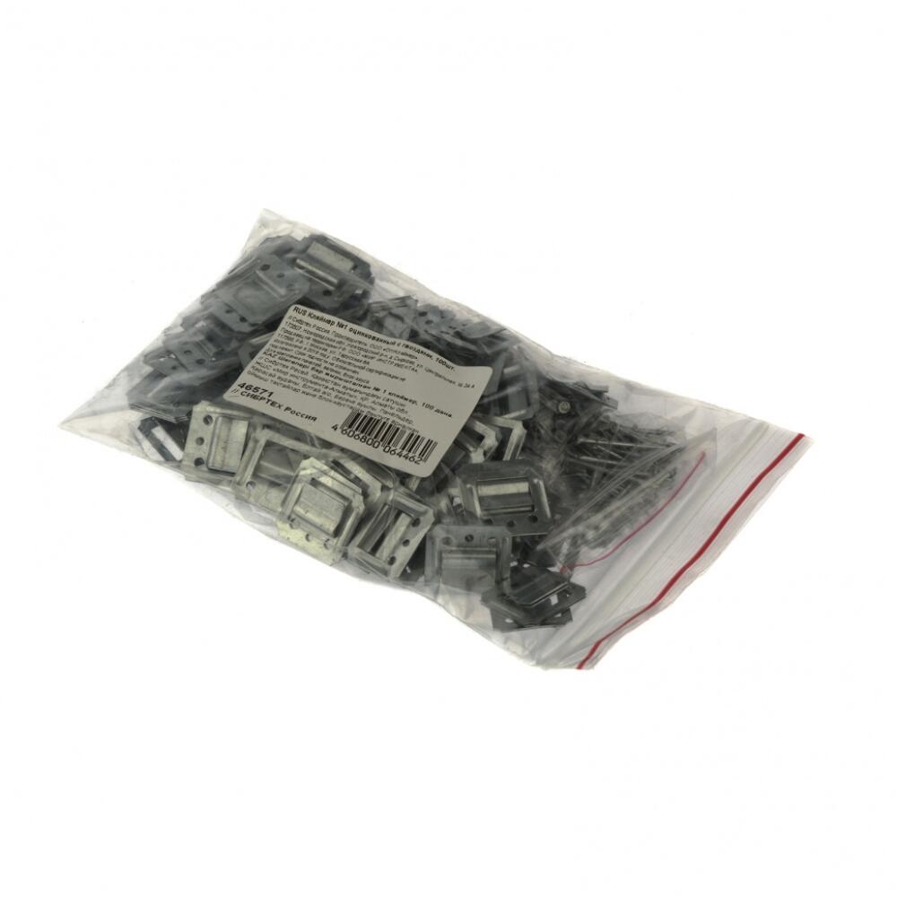 Оцинкованный кляймер №1 Сибртех 46571, с гвоздями, 100 шт. в упаковке, — крепежный элемент, применяющийся при отделке стен виниловой вагонкой, блок-хаусом или МДФ-панелями. Обеспечивает скрытое крепление, т. к. не виден снаружи и не портит внешний вид отделочного покрытия. Кляймер используется во время строительства домов и ремонта помещений.