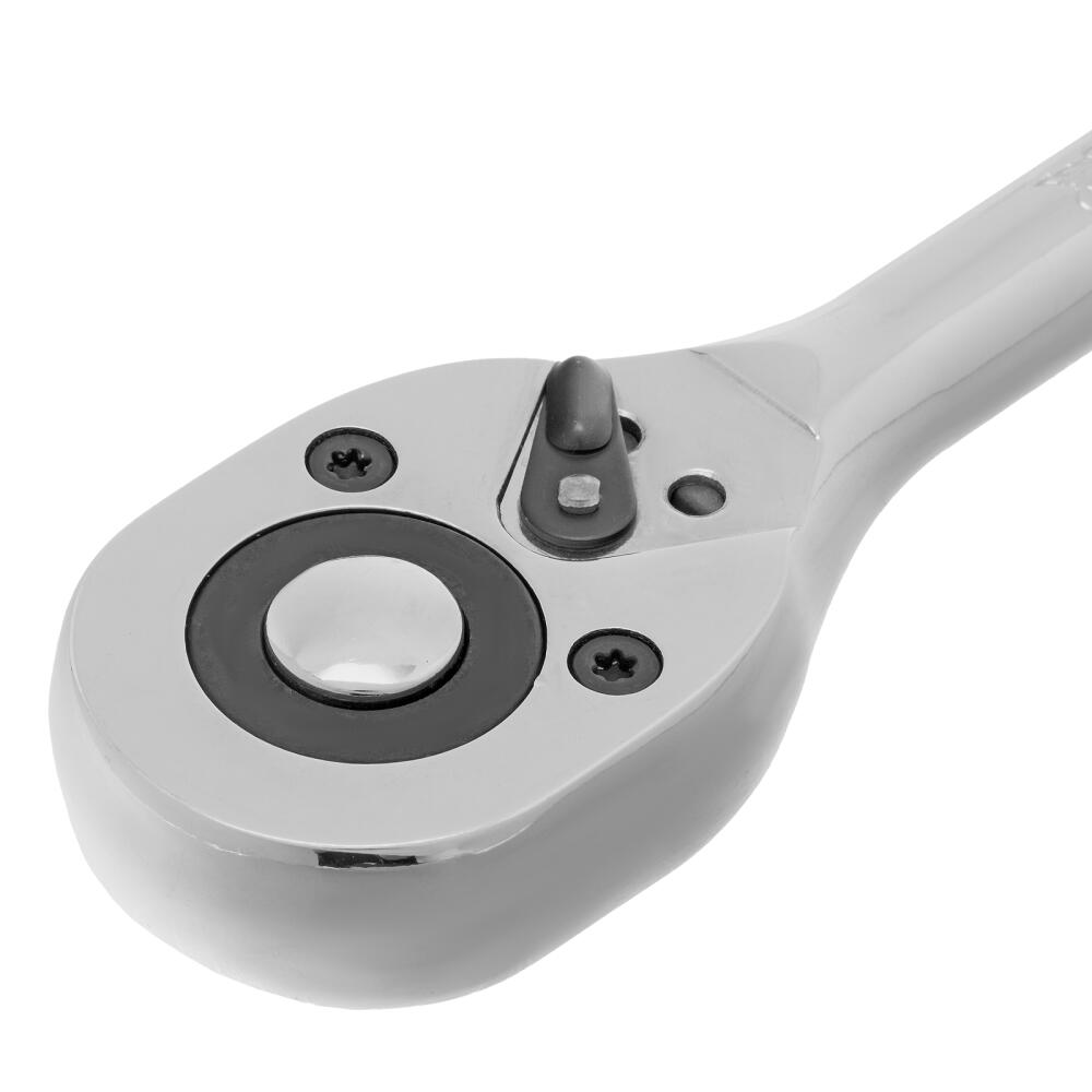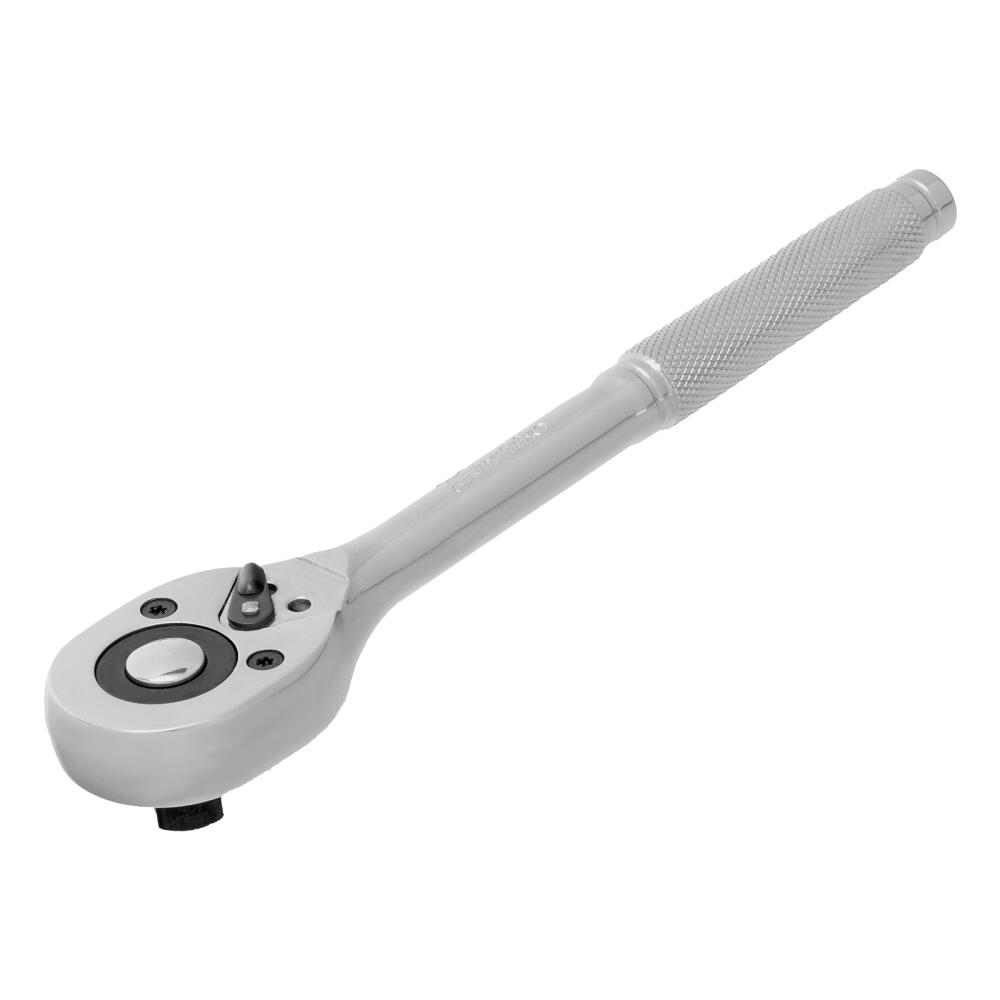 Хромированный ключ-трещотка Matrix 14015 с переключателем, из стали CrV, с присоединительным размером 1/2", — ручной инструмент для монтажа и демонтажа резьбовых соединений. Совместим с торцевыми головками, имеющими посадочное гнездо соответствующего размера. Храповой механизм облегчает работу в труднодоступных местах. Инструмент применяется для ремонта техники, автомобилей, также используется в быту.