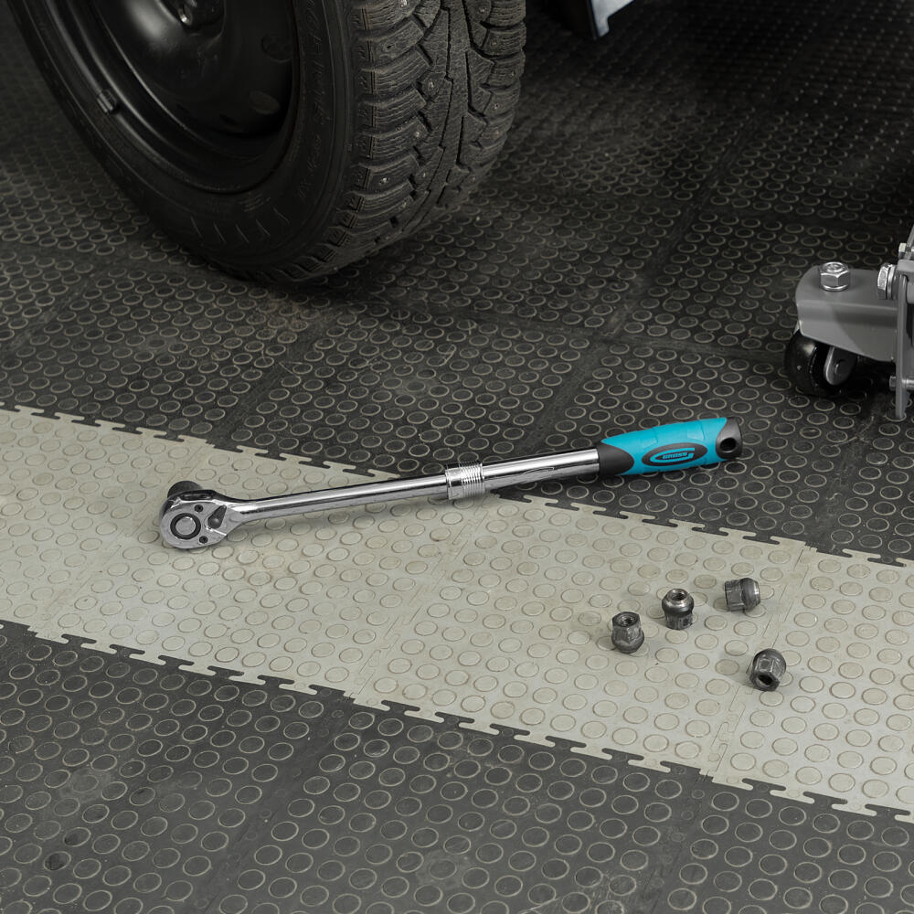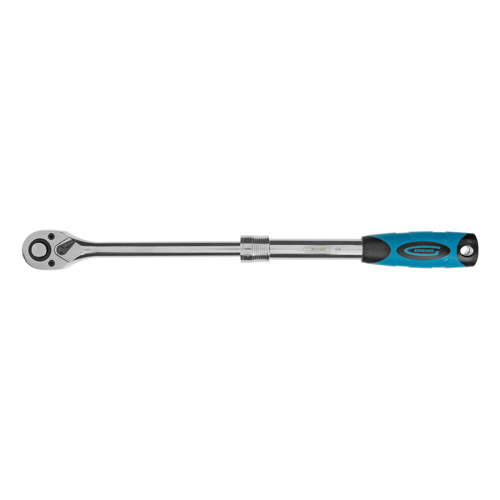 Телескопический хромированный трещоточный ключ Gross 14070, 305-445 мм, из стали CrV, с присоединительным квадратом 1/2 дюйма и 2-компонентной рукояткой, предназначен для монтажных работ с резьбовыми соединениями. Особенно удобен для работы в труднодоступных местах, т.к. имеет запатентованный механизм фиксации телескопической рукоятки. Ее длину можно изменить с 305 до 445 мм. Инструмент используется в слесарных мастерских, автосервисах, пригодится и в быту.