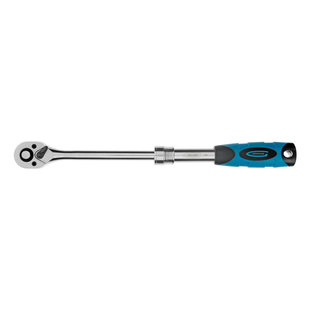 Телескопический хромированный трещоточный ключ Gross 14072, 215-315 мм, из стали CrV, с присоединительным квадратом 3/8 дюйма и 2-компонентной рукояткой, предназначен для монтажных работ с резьбовыми соединениями. Особенно удобен для работы в труднодоступных местах, т.к. имеет запатентованный механизм фиксации телескопической рукоятки. Ее длину можно изменить с 215 до 315 мм. Инструмент используется в слесарных мастерских, автосервисах, пригодится и в быту.