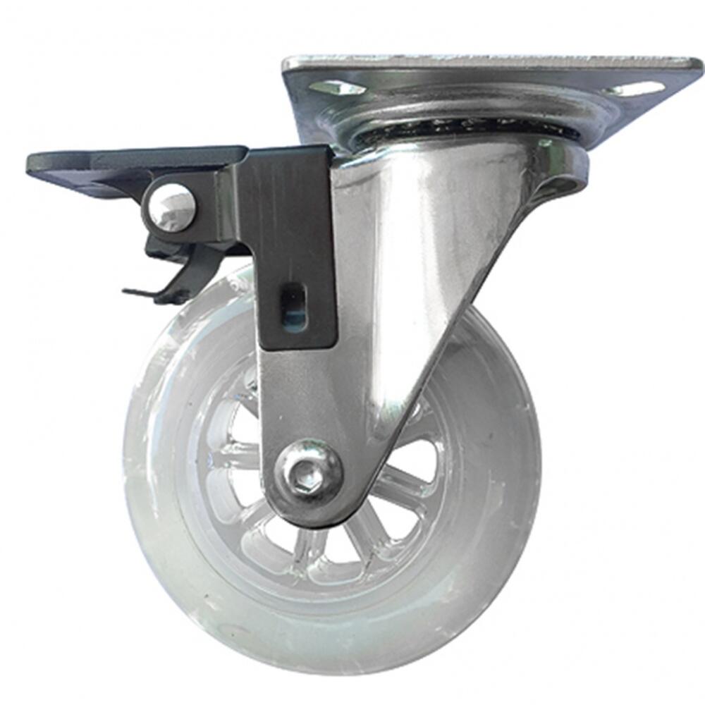 Прозрачное поворотное колесо Сибртех 68738 из полиуретана, диаметром 75 мм, с платформенным креплением и тормозом, устанавливается на ручные тележки и служит для перемещения грузов. Не производит шума, поэтому оптимально для использования в помещениях.