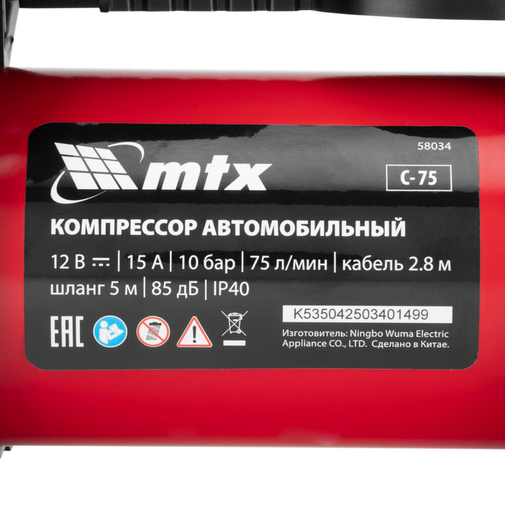 Автомобильный компрессор MTX C-75 58034 производительностью 75 л/мин работает от сети 12 В и подает сжатый воздух под давлением 10 атм. С его помощью можно быстро накачать шины автомобиля или велосипеда, а также подкачать мяч, надувной матрац, лодку и т.д. В комплект поставки включен набор из 3 насадок для эффективного решения различных задач. Компрессор подключается к автомобильному аккумулятору, незаменим в поездке и на отдыхе.
