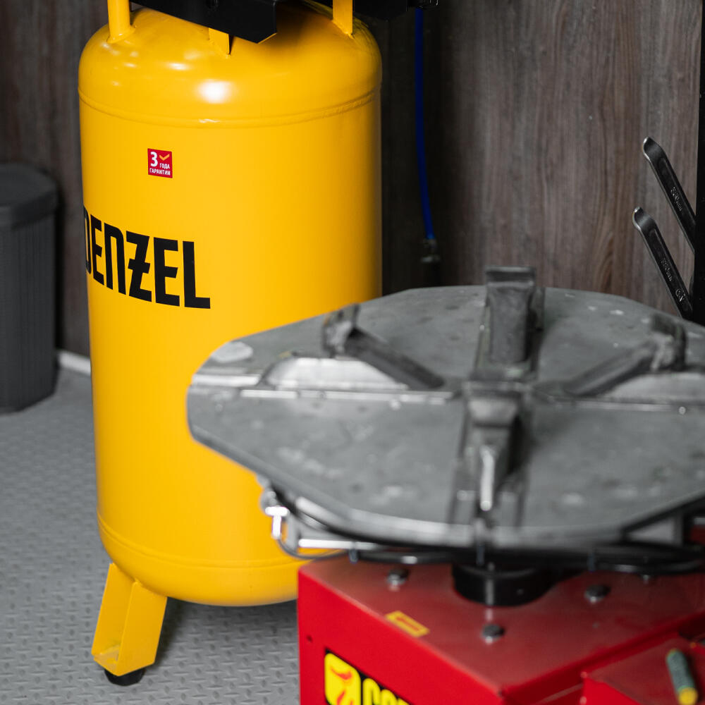 Компрессор воздушный с ременным приводом Denzel BCV2200/100V 58112 мощностью 2,3 кВт, с ресивером объемом 100 л используется для обеспечения сжатым воздухом таких инструментов, как краскораспылитель, гайковерт, гвоздезабивной пистолет, дрель, пистолет для накачки шин и пр. Высокая производительность 440 л/мин позволяет использовать его не только в загородных домах и гаражах, но и на фабриках, станциях технического обслуживания автомобилей, в различных мастерских.,Сжатый воздух накапливается в ресивере объемом 100 литров. Он располагается вертикально, что позволяет сэкономить место на рабочей площадке. Для устойчивости компрессор крепится к стене или полу.