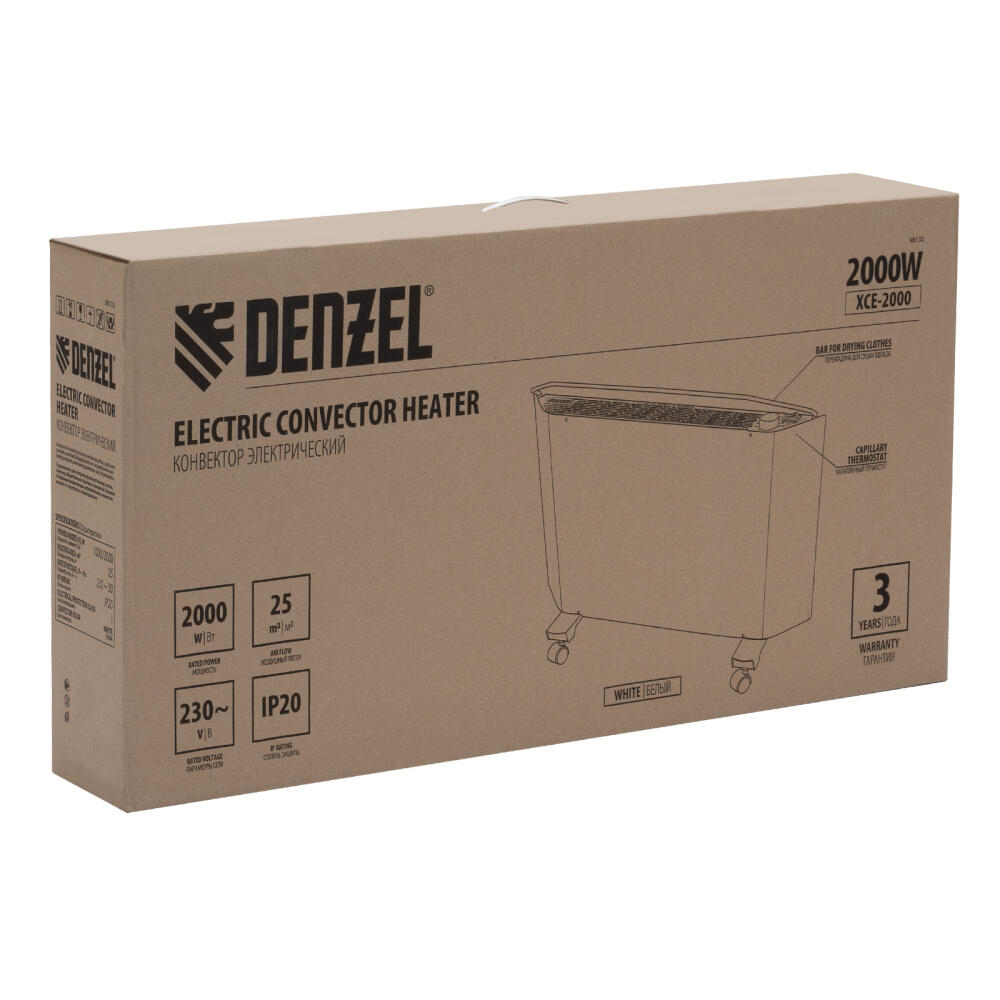Электрический конвектор Denzel XCE-2000 98132 белого цвета, максимальной мощностью 2000 Вт, с сушилкой для одежды, колесами и X-образным нагревательным элементом, работает от сети 230 В и предназначен для обогрева закрытых помещений площадью до 25 м2. Надежный и долговечный X-образный нагревательный элемент обеспечивает быстрый нагрев до необходимой температуры.