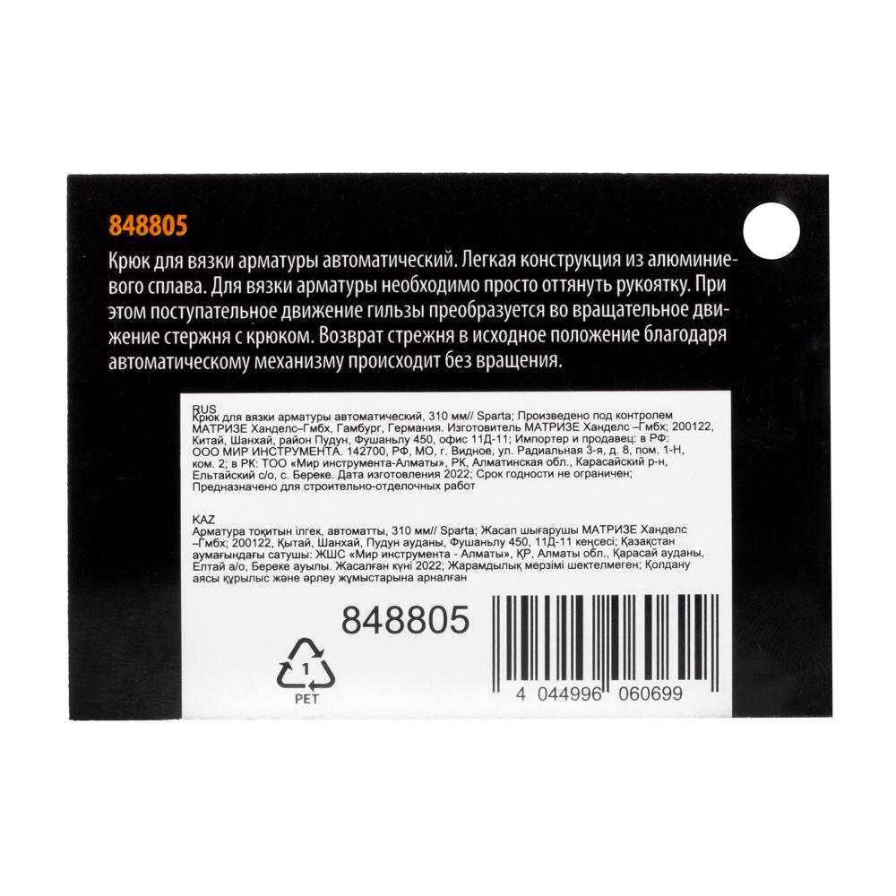 Автоматический крюк Sparta 848805 длиной 310 мм применяется для вязки арматуры. Позволяет быстро создать каркас и сетку из проволоки любого диаметра. Крюк используется для установки железобетонных конструкций и будет полезен на строительной площадке.