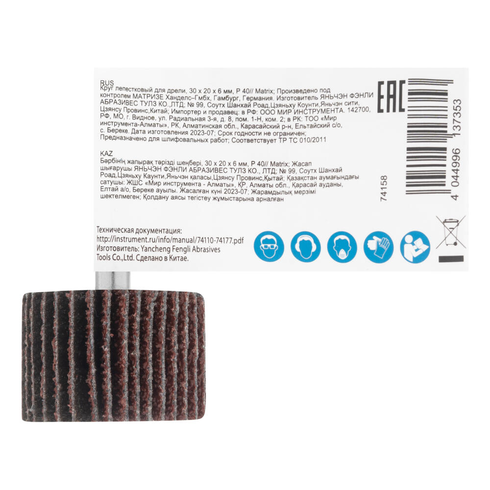 Лепестковый круг Matrix 74158 размером 30 х 20 х 6 мм, с зернистостью P 40, — оснастка для дрелей и прямых шлифовальных машинок с посадочным гнездом 6 мм, рассчитанная на скорость до 16000 об/мин. Круг применяется для грубой обработки древесины, металла и других материалов. Крупнозернистый абразив P 40 эффективно снимает толстые слои краски и ржавчины, зачищает сварные швы, удаляет заусенцы.
