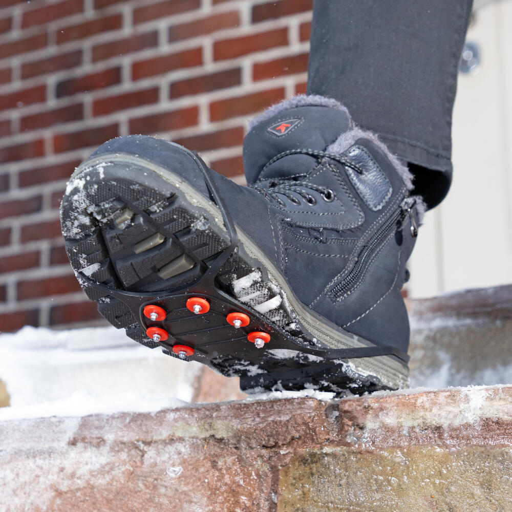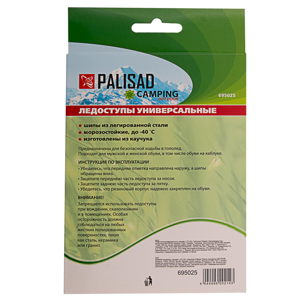 Универсальные ледоступы Palisad Camping 695025 размера L (37-42) предназначены для безопасного передвижения по обледеневшим дорогам. В передней части каждой накладки имеется 6 элементов с заостренными зубцами, которые обеспечивают надежное сцепление с поверхностью. С ледоступами можно гулять, ходить в магазин и ездить на работу, не опасаясь падения.