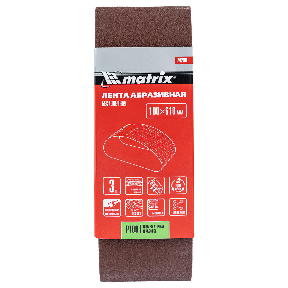 Абразивная лента Matrix 74290 зернистостью P 100 поставляется в наборе из 3 шт. и используется на ленточных шлифовальных машинах, совместимых со сменными элементами размером 100 х 610 мм. Применяется для чистовой обработки и получения гладкой поверхности деревянных, пластиковых и металлических предметов. Подходит для снятия тонкого слоя краски, ржавчины, удаления мелких заусенцев и т.д.