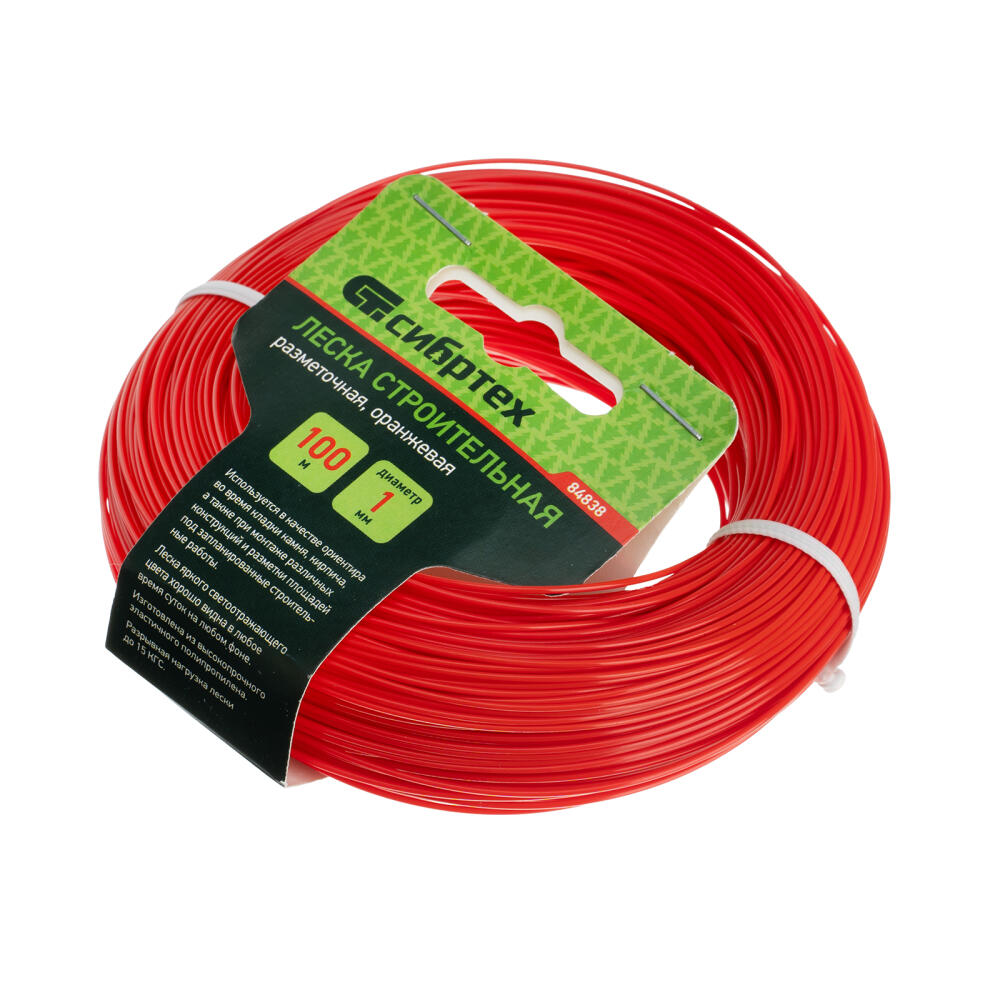 Леска строительная Сибртех 84838, длина 100 м, диаметр 1 мм, оранжевого цвета, пригодится на строительной площадке как ориентир при укладке материалов, установке конструкций. Также она будет полезна для садоводов для разметки территории. Если леску натянуть, то получается идеально ровная линия, что повышает точность работы, а также позволяет проводить замеры с ее помощью.