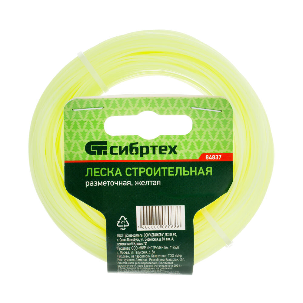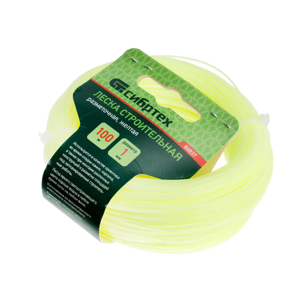 Леска строительная Сибртех 84837, длина 100 м, диаметр 1 мм, желтого цвета, пригодится на строительной площадке как ориентир при укладке материалов, установке конструкций. Также она будет полезна для садоводов для разметки территории. Если леску натянуть, то получается идеально ровная линия, что повышает точность работы, а также позволяет проводить замеры с ее помощью.