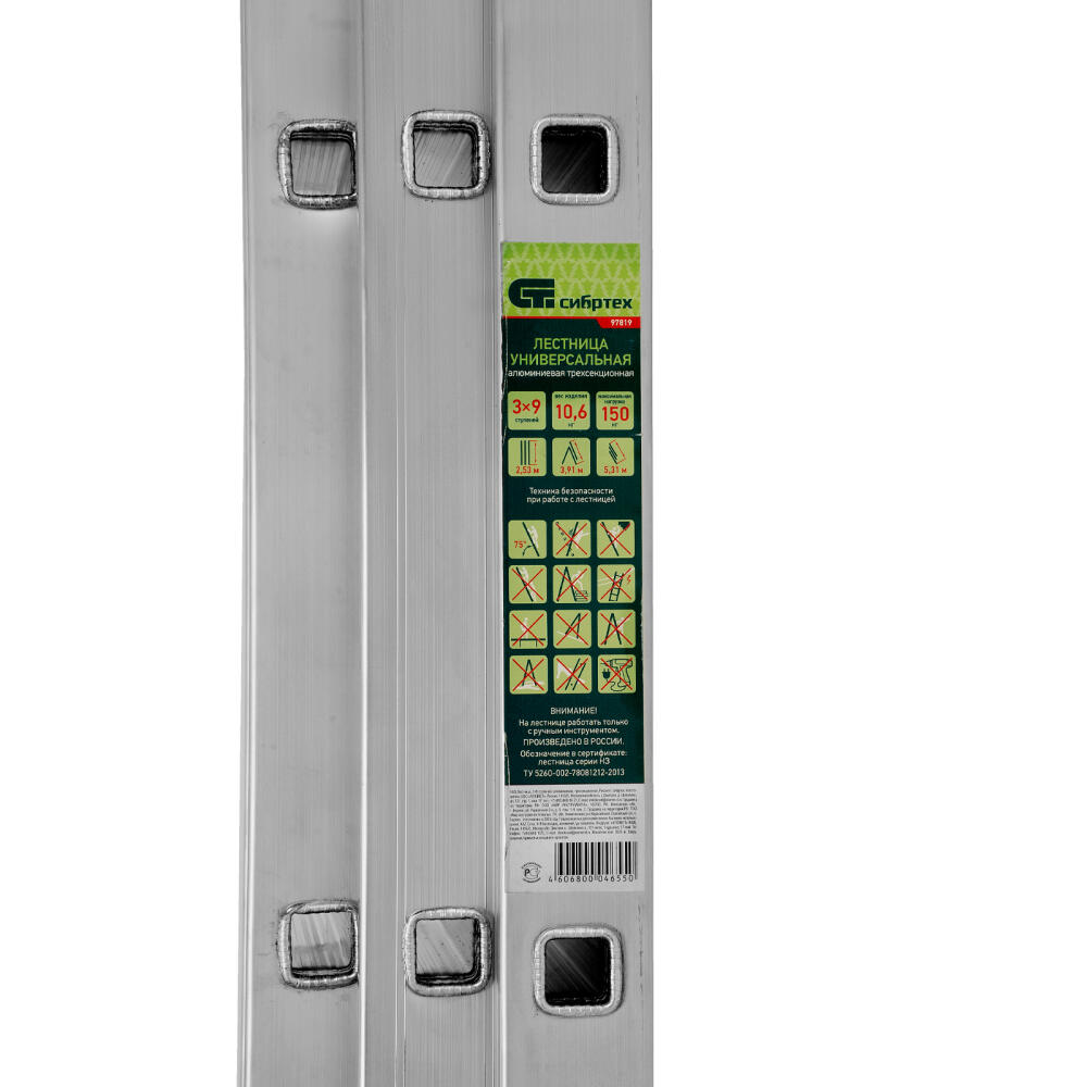 Алюминиевая трехсекционная лестница Сибртех 97819 состоит из 3 секций по 9 ступеней каждая. Она предназначена для использования преимущественно на открытом воздухе и в помещениях с высокими потолками, подойдет также для работников коммунальных служб и строителей. Лестница поможет провести отделочные, монтажные работы, будет полезна на складе.