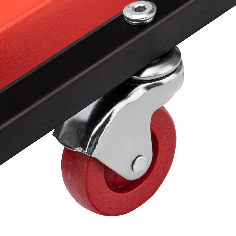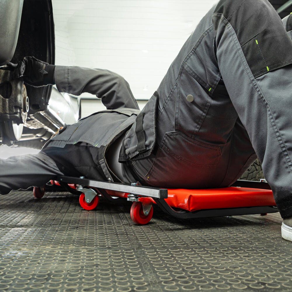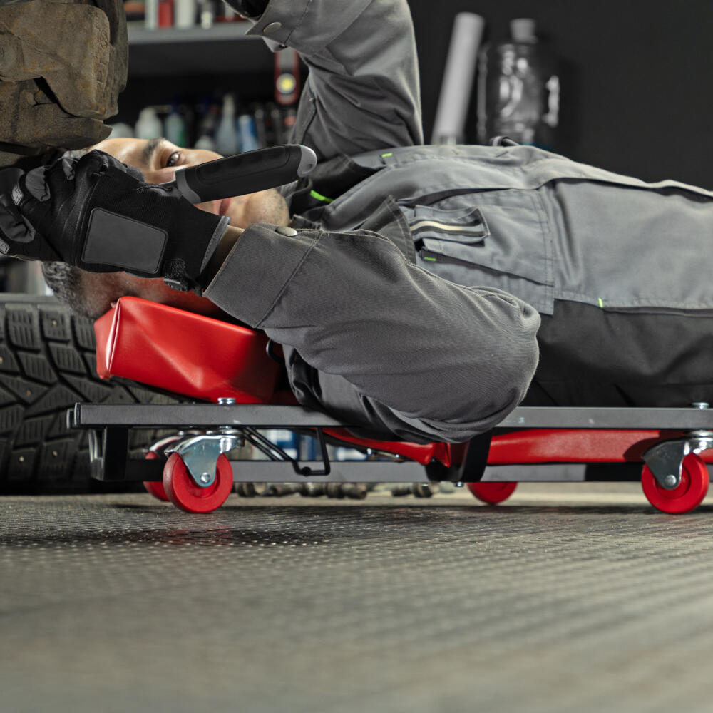 Лежак ремонтный на 6-ти колесах Matrix 567455, 1030 х 440 х 120 мм, с поднимающимся подголовником, позволяет легко въехать под машину для осуществления ее техобслуживания, ремонта систем питания, выпускной системы, трансмиссии и т.д. Он станет незаменимым помощником для автолюбителей в гараже и профессионалов в автомастерской.