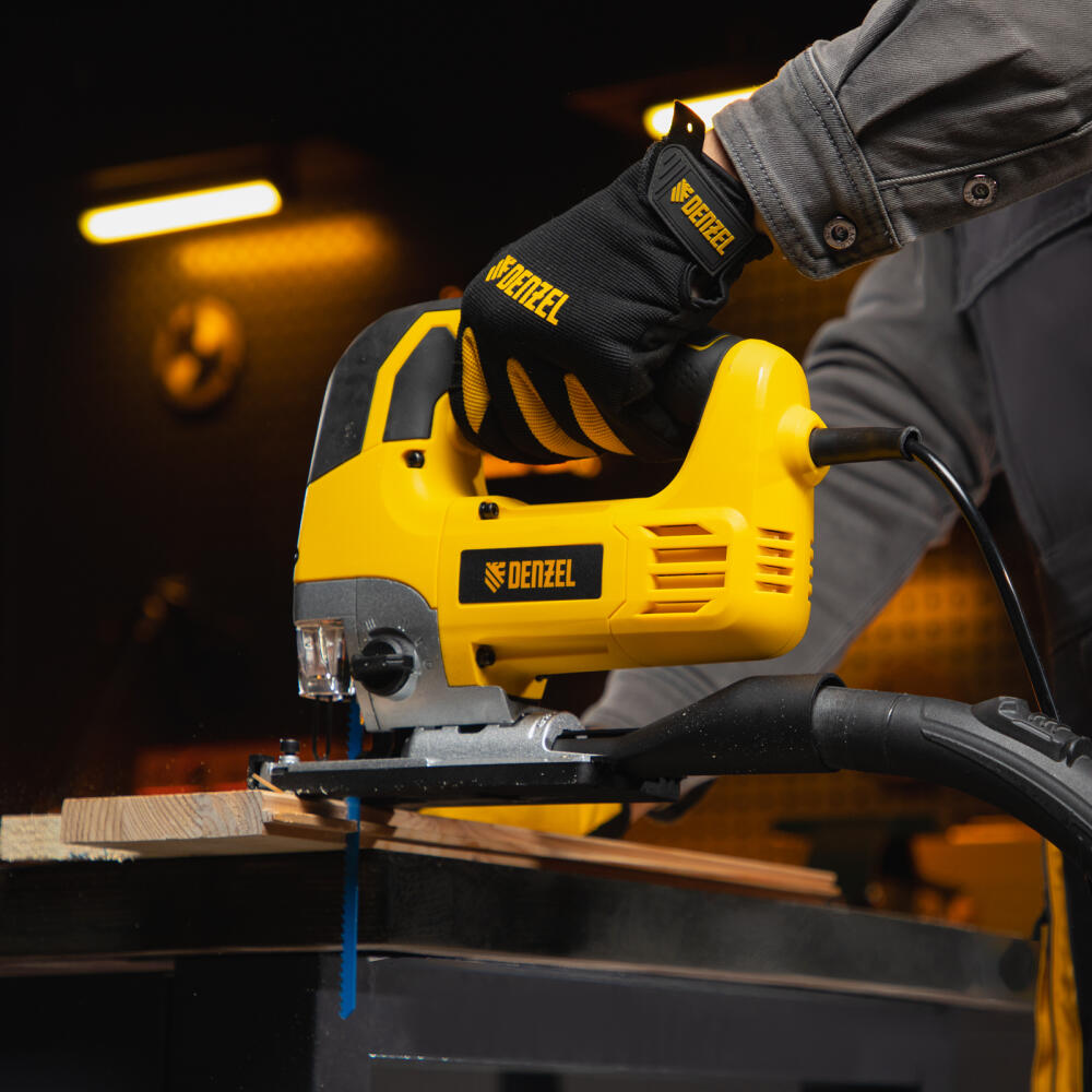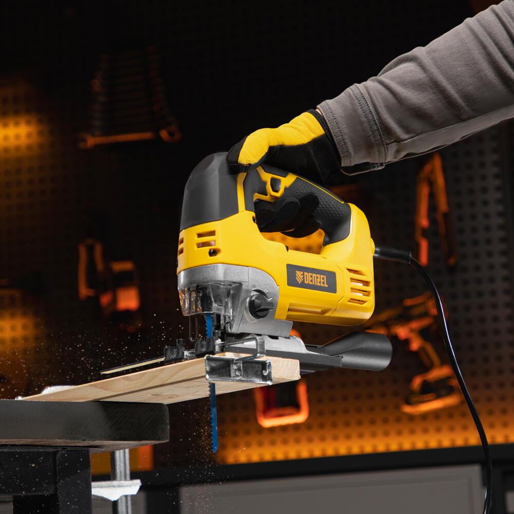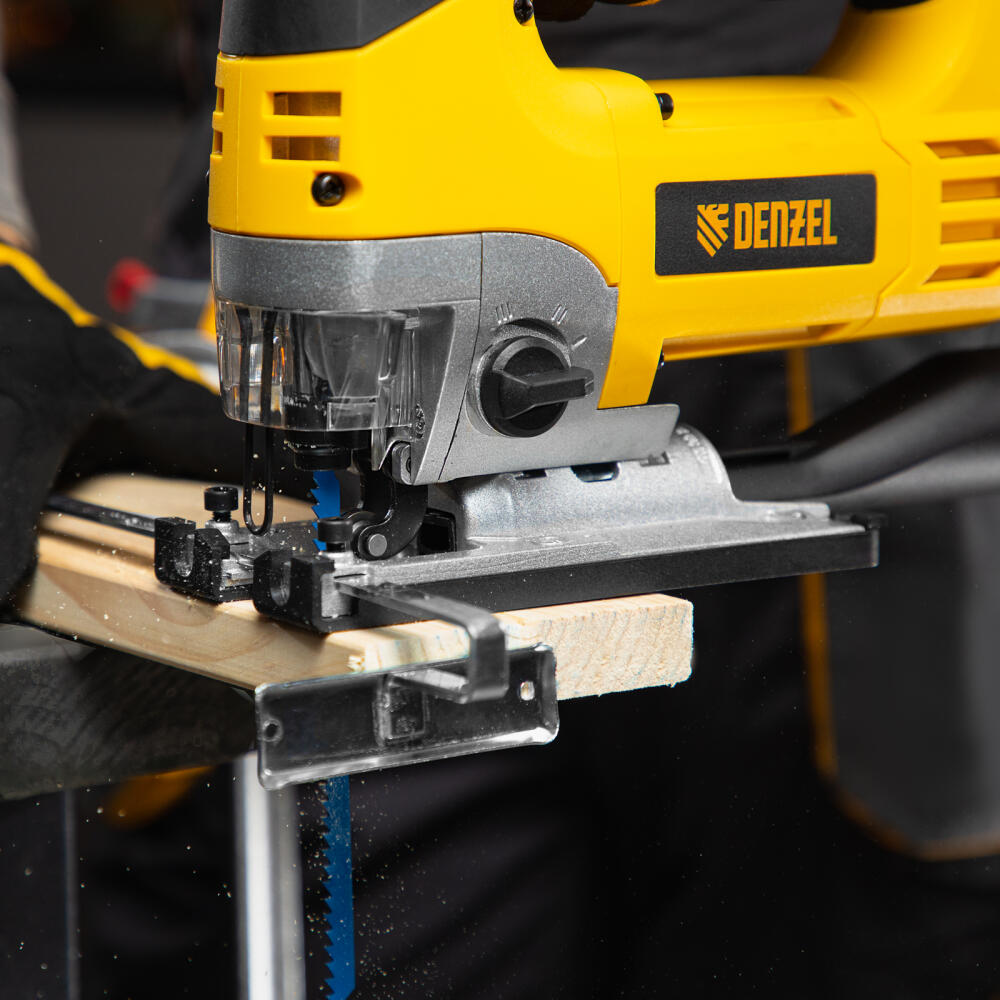 Электрический лобзик Denzel JS-110 27107 мощностью 750 Вт предназначен для прямого и фигурного реза листовых материалов из металла, древесины, и пластмассы, а также для вырезки варочных панелей или отверстий под мойки в столешницах. Это наиболее производительная модель в линейке производителя. Электродвигатель Denzel обеспечивает частоту хода пильного полотна в диапазоне 1100-3000 ход/мин. Максимальная глубина пропила составляет: до 110 мм для древесины, до 25 мм для цветных металлов и до 10 мм для стали. Угол наклона подошвы регулируется, что позволяет совершать пропилы под углом до 45°. Лобзик подключается к сети, поэтому время работы не ограничено.