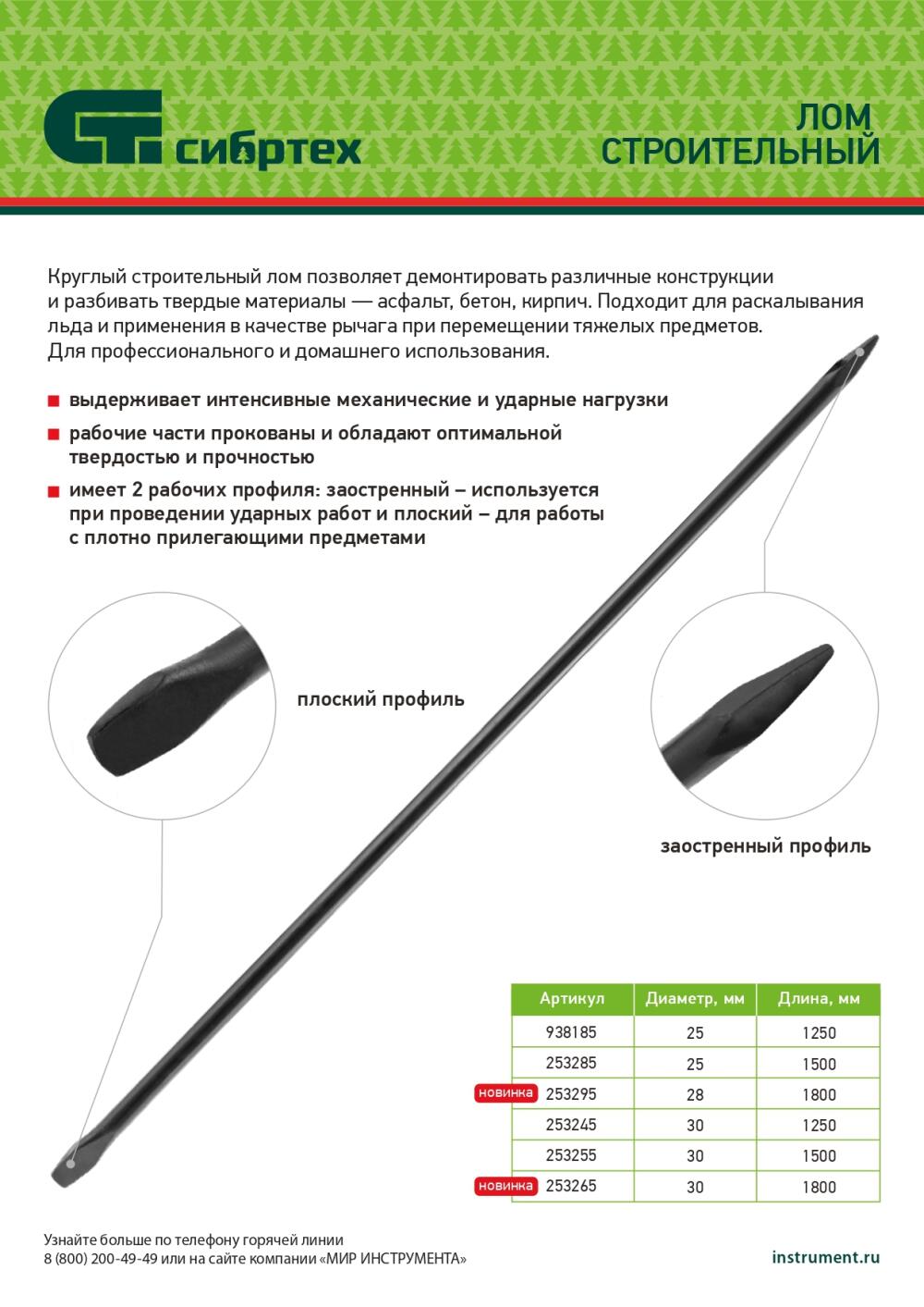 Круглый строительный лом 253285 длиной 1500 мм и диаметром 25 мм позволяет демонтировать различные конструкции и разбивать твердые материалы — асфальт, бетон, кирпич. Подходит для раскалывания льда и применения в качестве рычага при перемещении тяжелых предметов. Инструмент предназначен для профессионального использования, также будет полезен в домашнем хозяйстве.