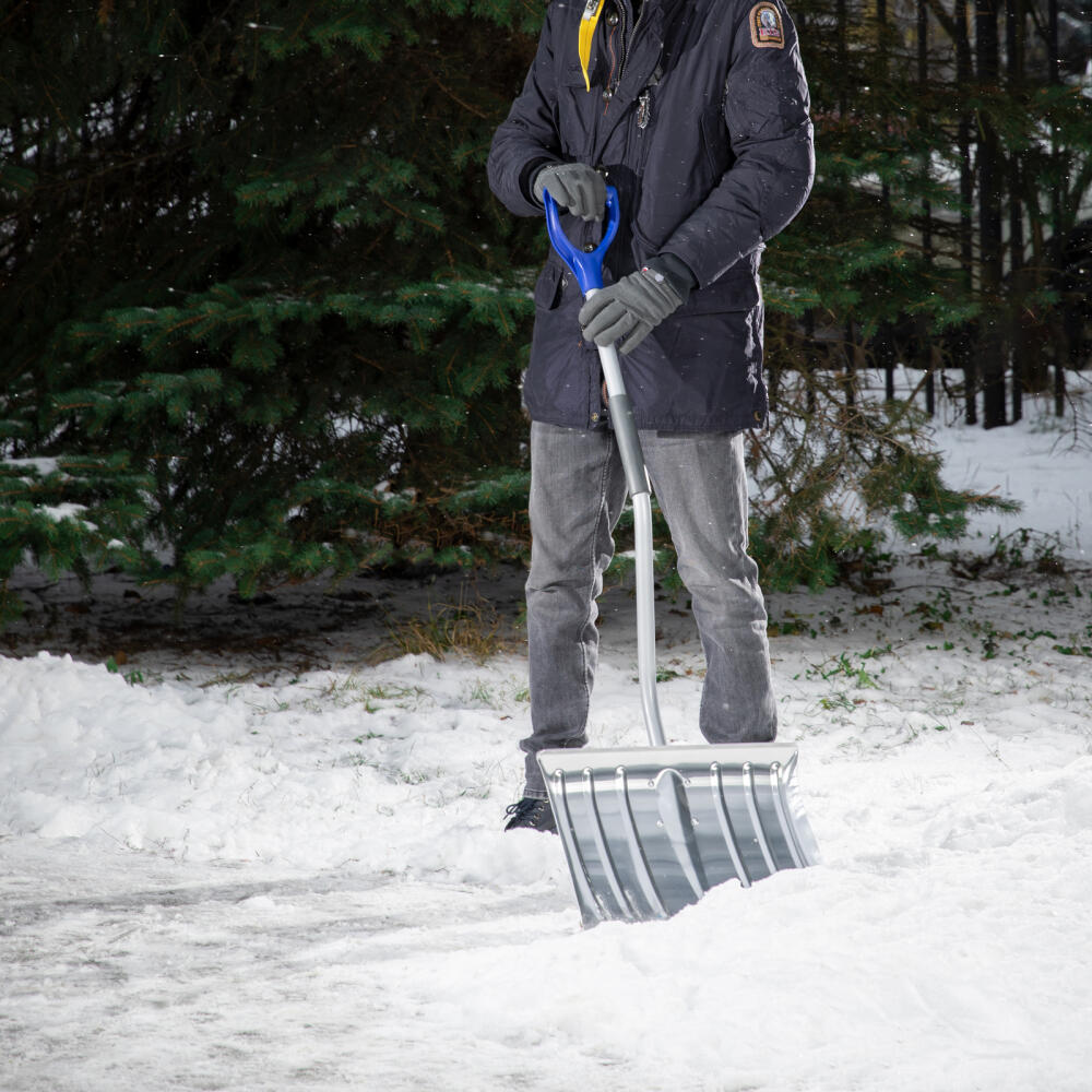 Алюминиевая лопата для уборки снега Palisad 61573 размером 465 х 340 х 1300 мм, со стальным черенком, используется для снегоуборочных работ на придомовой территории, на дачном участке или перед гаражом. Изогнутый черенок повышает комфорт во время эксплуатации. Благодаря ребрам жесткости лопата устойчива к повышенным нагрузкам.