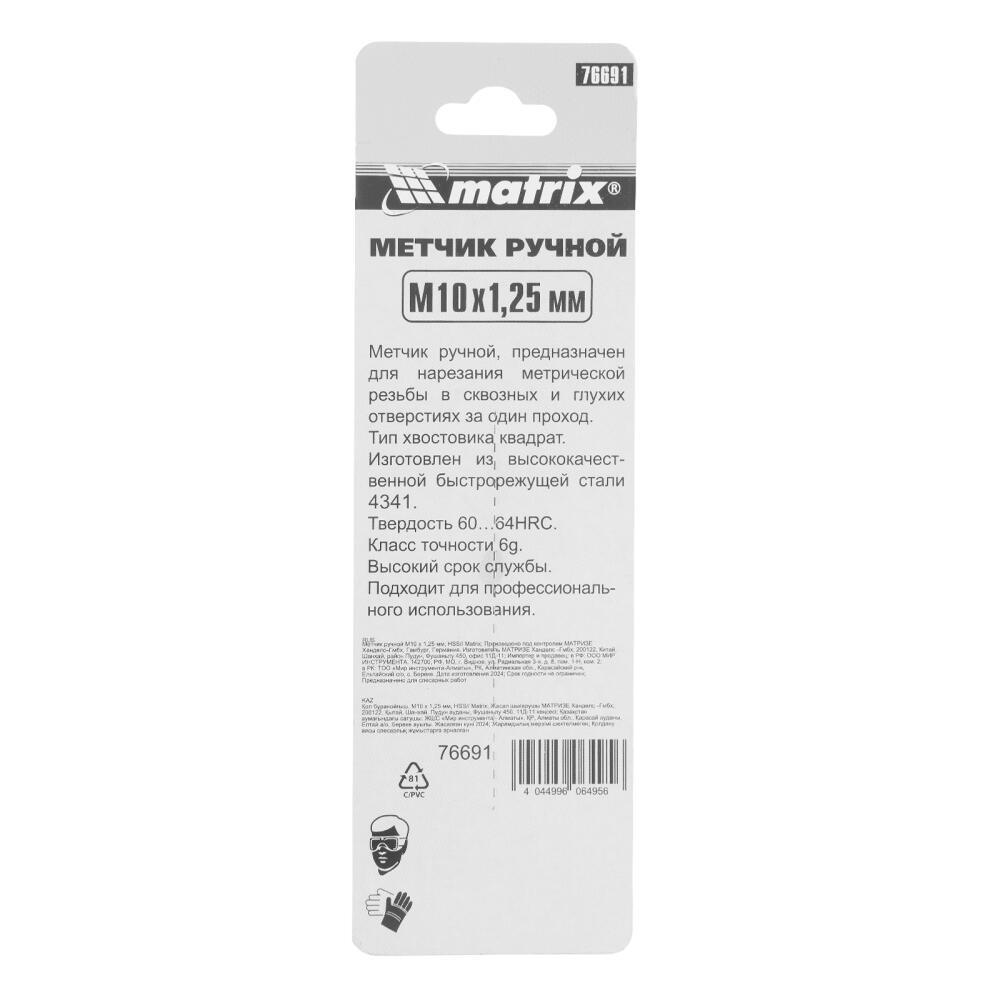 Ручной метчик Matrix 76691, HSS, — резьбонарезной инструмент, который используется для создания резьбы диаметром М10 и шагом 1,25 мм. Оптимален для работы с деталями из твердой стали прочностью до 900 Н/мм². Нарезает резьбу за один проход. Метчик устанавливается на метчикодержатель с патроном под хвостовик 5,4 мм. Будет полезен в слесарной мастерской, а также дома или в гараже.