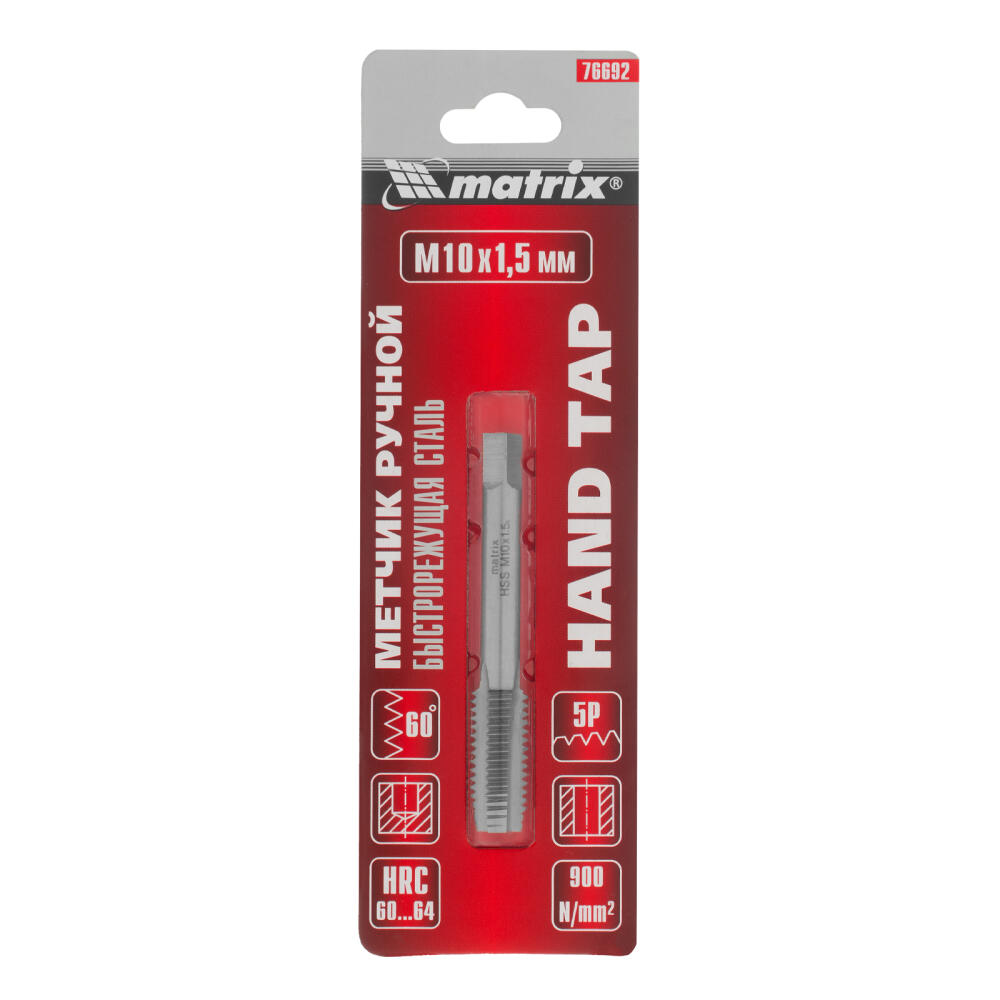 Ручной метчик Matrix 76692, HSS, — резьбонарезной инструмент, который используется для создания резьбы диаметром М10 и шагом 1,5 мм. Оптимален для работы с деталями из твердой стали прочностью до 900 Н/мм². Нарезает резьбу за один проход. Метчик устанавливается на метчикодержатель с патроном под хвостовик 5,4 мм. Будет полезен в слесарной мастерской, а также дома или в гараже.