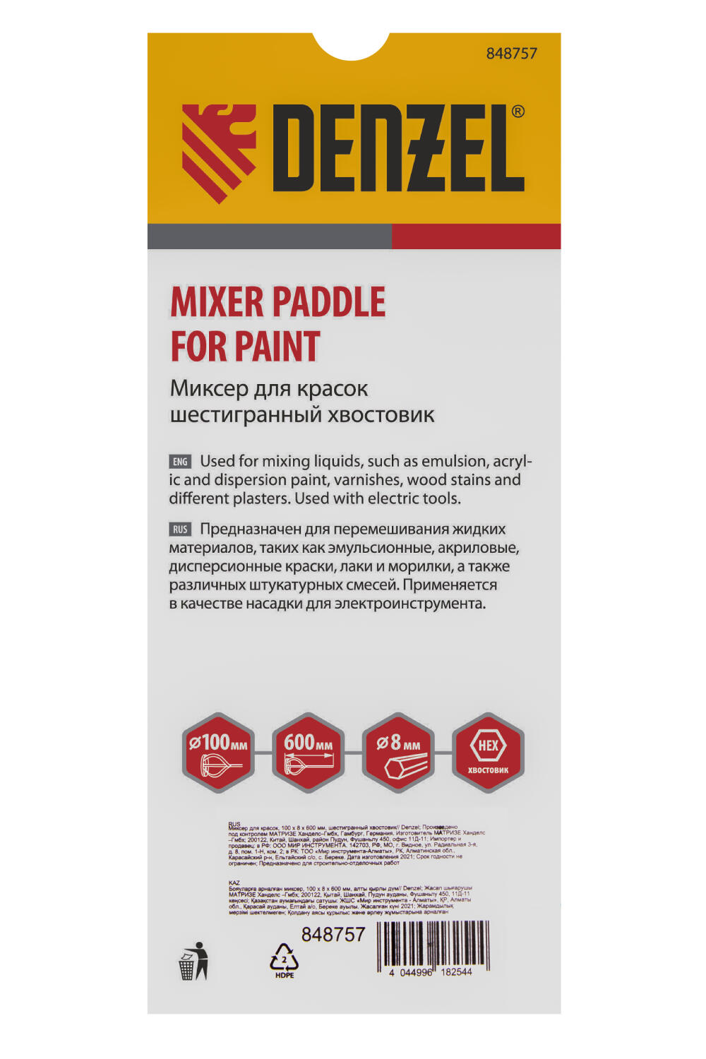 Миксер для красок Denzel 848757 размером 100 х 8 х 600 мм, с шестигранным хвостовиком, — насадка-венчик для электроинструмента, обеспечивающая равномерное перемешивание жидких строительных растворов, например, лакокрасочных материалов, морилок, штукатурно-клеевых смесей. Благодаря продуманной конструкции успешно справляется с поставленными задачами. На конце венчика имеется защитное кольцо, предохраняющее емкость, в которой размешивают раствор, от повреждений. Насадка используется во время проведения отделочных работ.