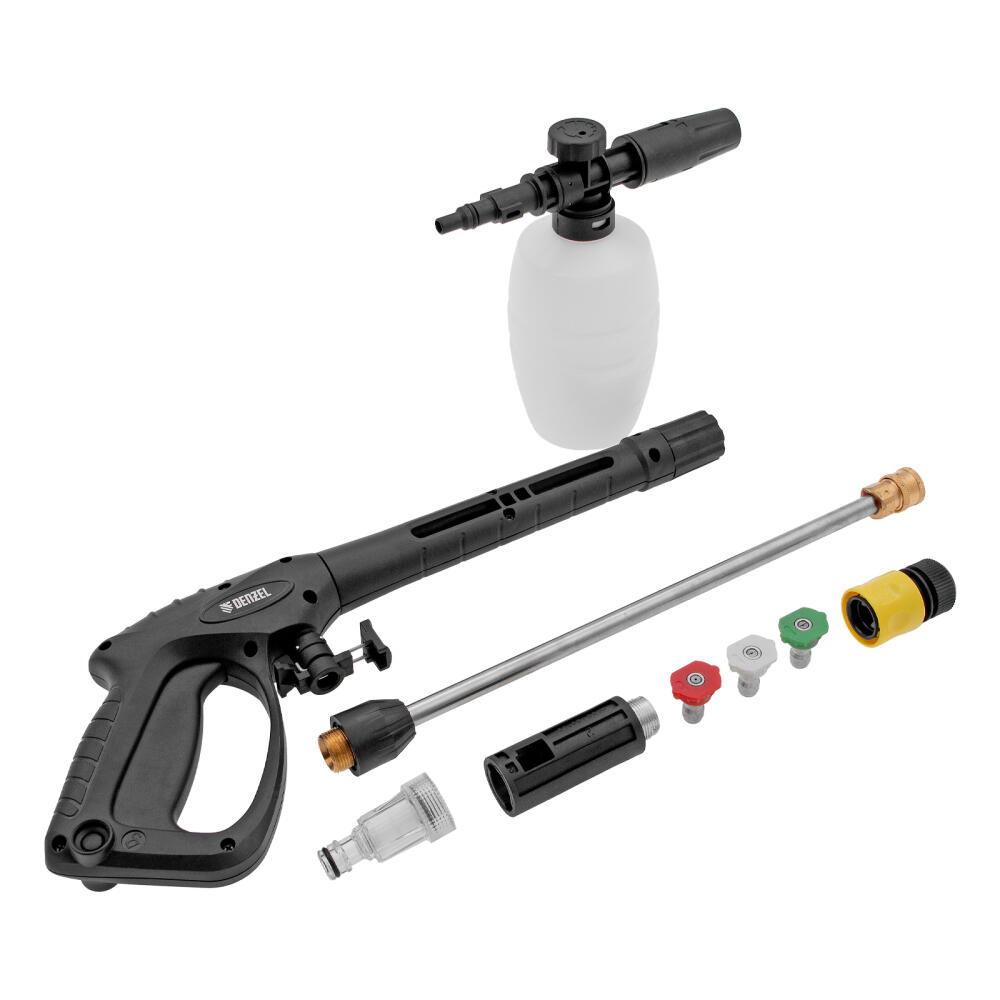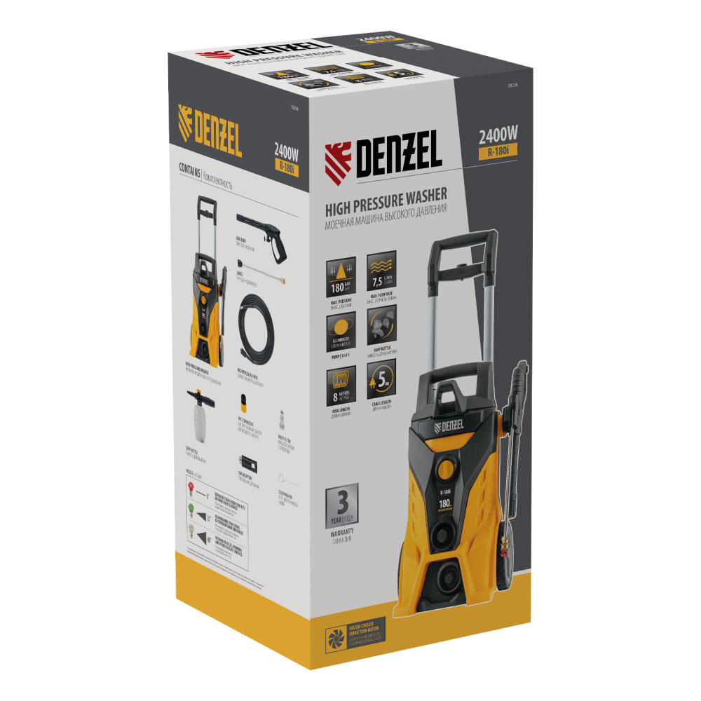 Моечная машина высокого давления Denzel R-180i с асинхронным двигателем оптимально подходит для очищения автомобилей, заборов, дорожек и садового инвентаря. Эффективно справляться с серьезными загрязнениями позволяют мощный мотор 2400 Вт и помпа с производительностью 7,5 л/мин и максимальным давлением 180 бар.,Отсутствие водопровода поблизости не станет проблемой. Мойка с насосом может производить забор воды из любых емкостей благодаря функции самовсасывания, при этом теряя не более 5% давления. Алюминиевая помпа со стальными плунжерами отличается высокой точностью подгонки деталей, что обеспечивает надежность и стабильное давление на выходе.