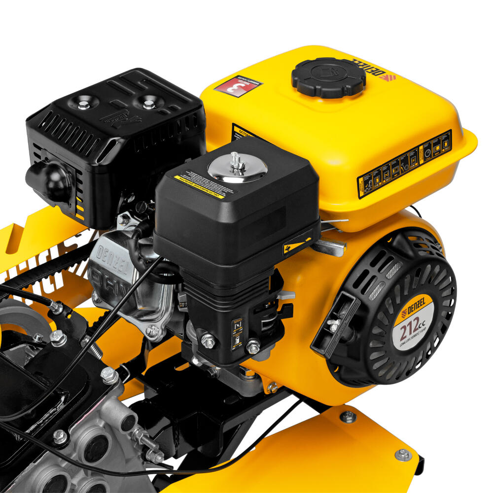 Мотоблок Denzel DPT-170SB 56451 мощностью 7 л. с., с ременным механизмом сцепления, оснащен фрезами 3 х 4, шкивом отбора мощности (ШОМ) и коробкой передач 2В/1Н. Предназначен для выполнения земляных работ: рыхления, вспахивания, прополки и т. д. Разборные фрезы с дополнительными секциями позволяют регулировать ширину обработки до 1 м.,Усиленный шестеренчато-цепной редуктор из алюминия позволяет работать длительное время с большими нагрузками. Благодаря шкиву отбора мощности и кронштейну диаметром 30 мм к мотоблоку можно подключать любое навесное оборудование Denzel, например, плуг, окучник, картофелевыкапыватель, что позволяет сократить расходы на приобретение дополнительной сельскохозяйственной техники. Установка прицепа Denzel 59950 позволяет использовать мотоблок для транспортировки грузов.