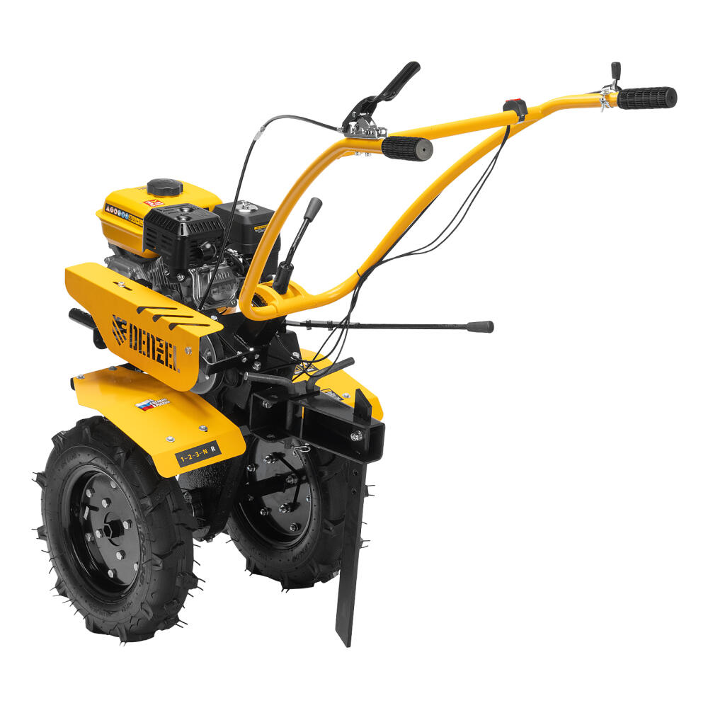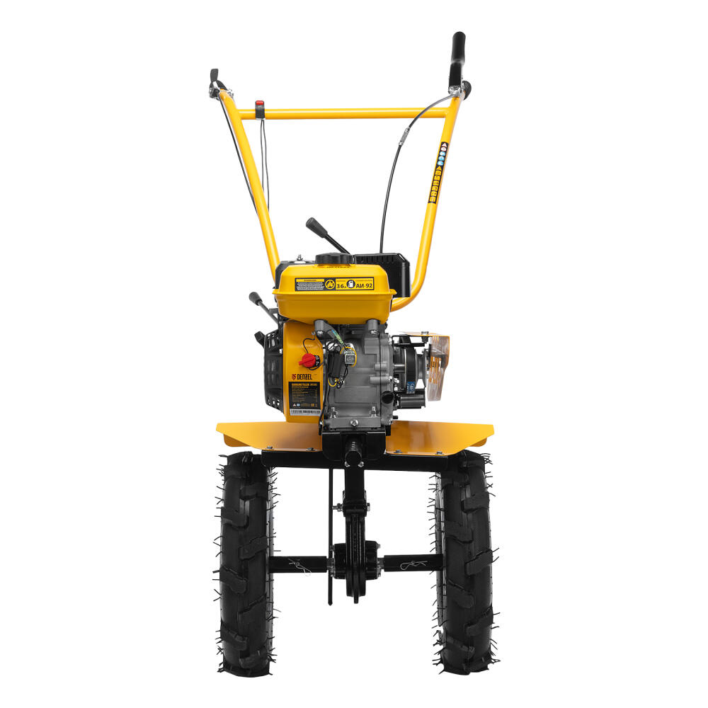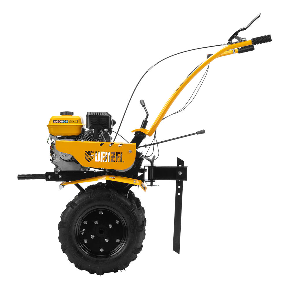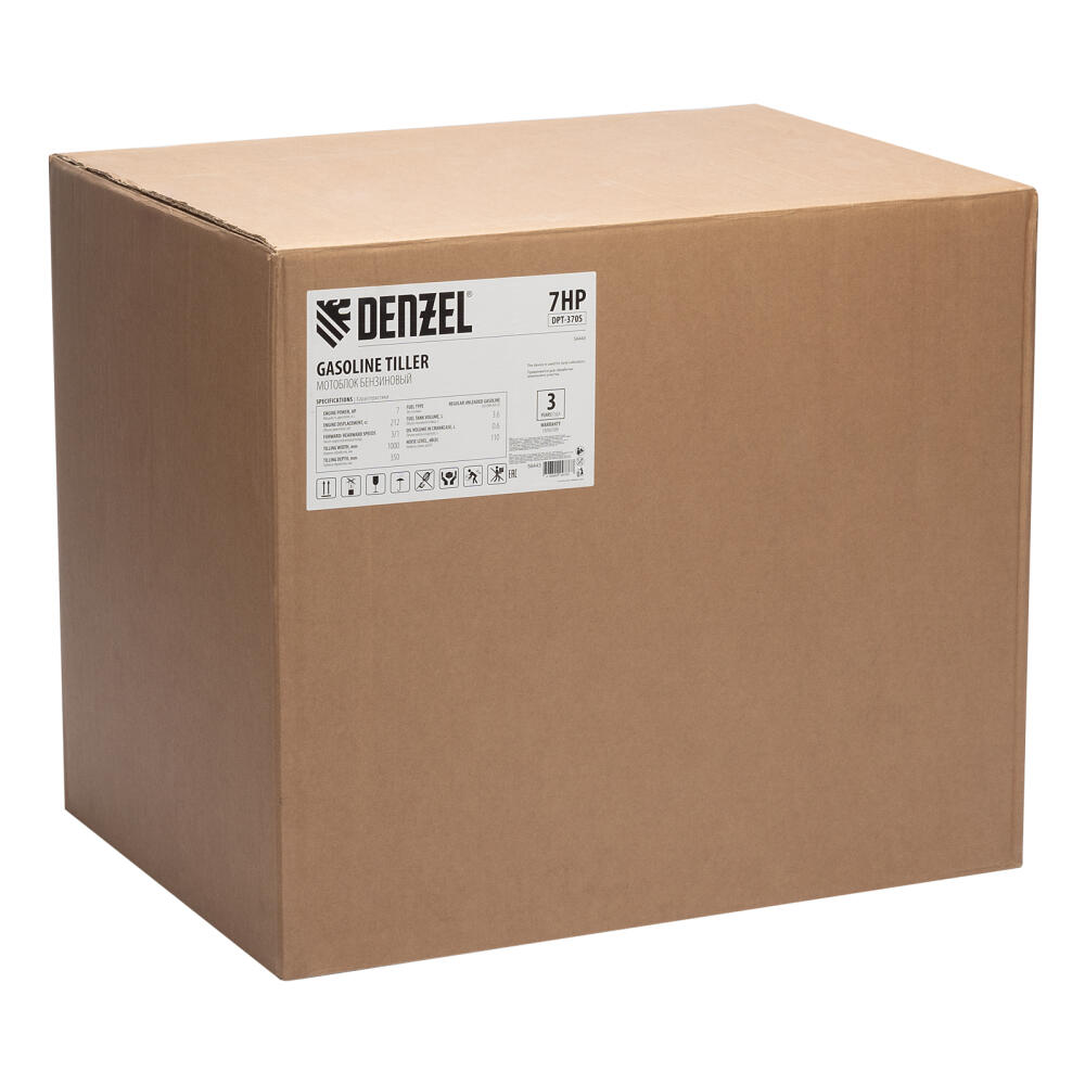 Мотоблок Denzel DPT-370S 56443 мощностью 7 л. с., с 24 фрезами (3 х 4 с каждой стороны), шкивом отбора мощности (ШОМ), количеством передач 3 вперед/1 назад, предназначен для рыхления, боронования, выравнивания почвы, прополки и выполнения других сельскохозяйственных работ на огородных и садовых участках при температуре от -15 до +40 ℃. Максимальная ширина обработки достигает 1000 мм, максимальная глубина — 350 мм.